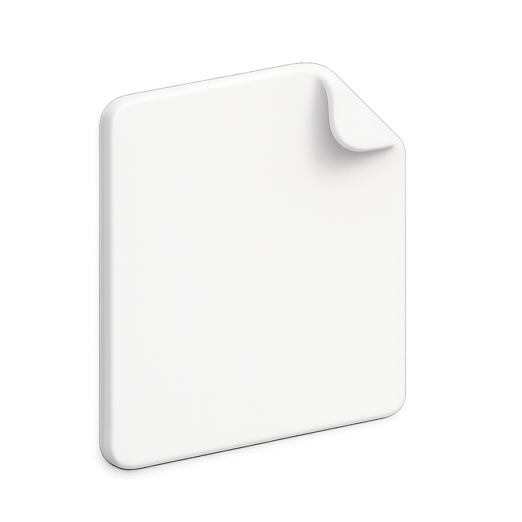 A minimalistic 3D icon representing a blank page, featuring a curled corner and a smooth, glossy finish. The design emphasizes a three-quarter view with an isometric feel against a dark background.