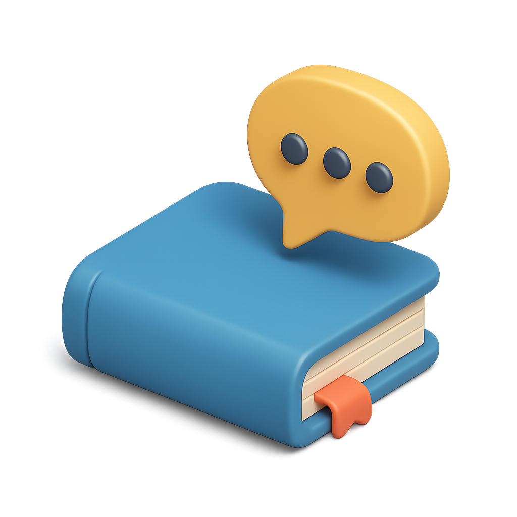 A colorful 3D icon depicting a book with a speech bubble above it, symbolizing natural language processing. The design features a transparent background and a volumetric, isometric style.