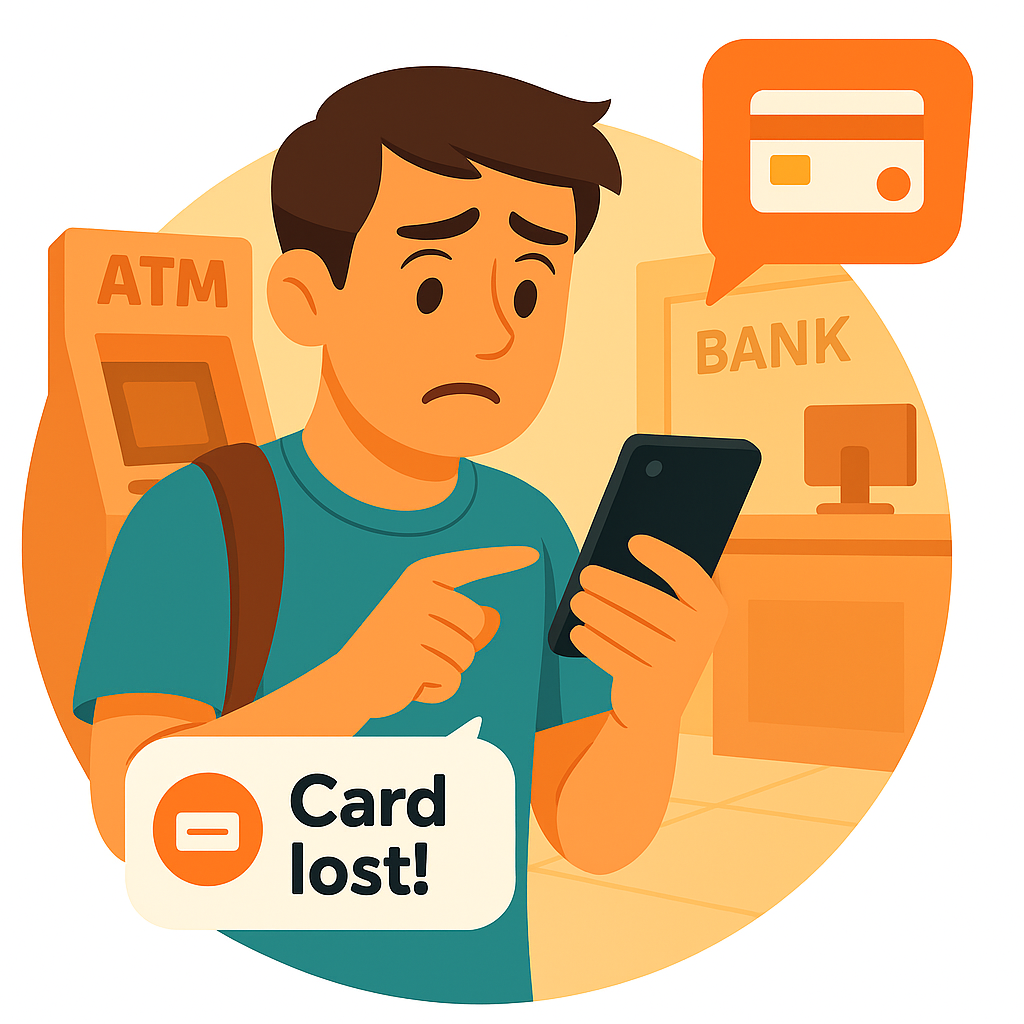 /Collection: /by davooda/Type: PNG/A digital illustration depicting a worried individual using a smartphone to report a lost bank card. The background features an ATM and a bank setting, emphasizing the urgency of the situation.