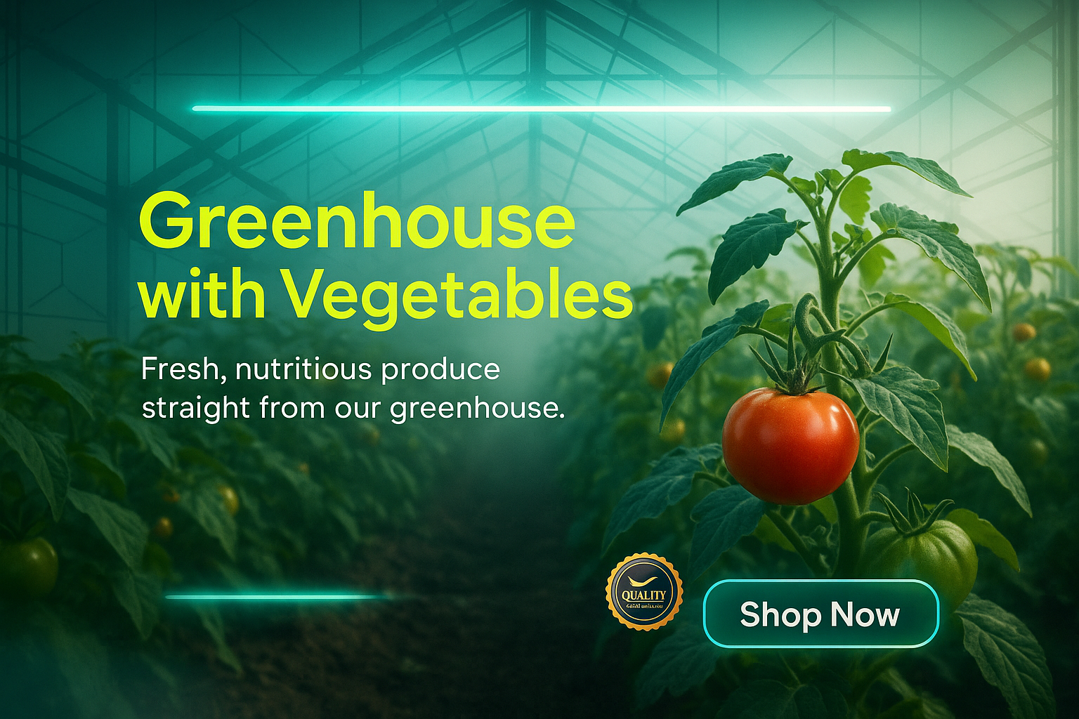 Promotional banner showcasing fresh vegetables in a greenhouse setting, designed with modern typography and a green color scheme to attract health-conscious consumers.