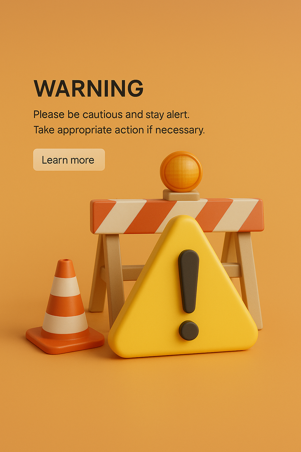 A detailed 3D illustration featuring caution elements like cones and a warning sign. The design is zoomed out with a smooth gradient background, emphasizing safety and alertness.