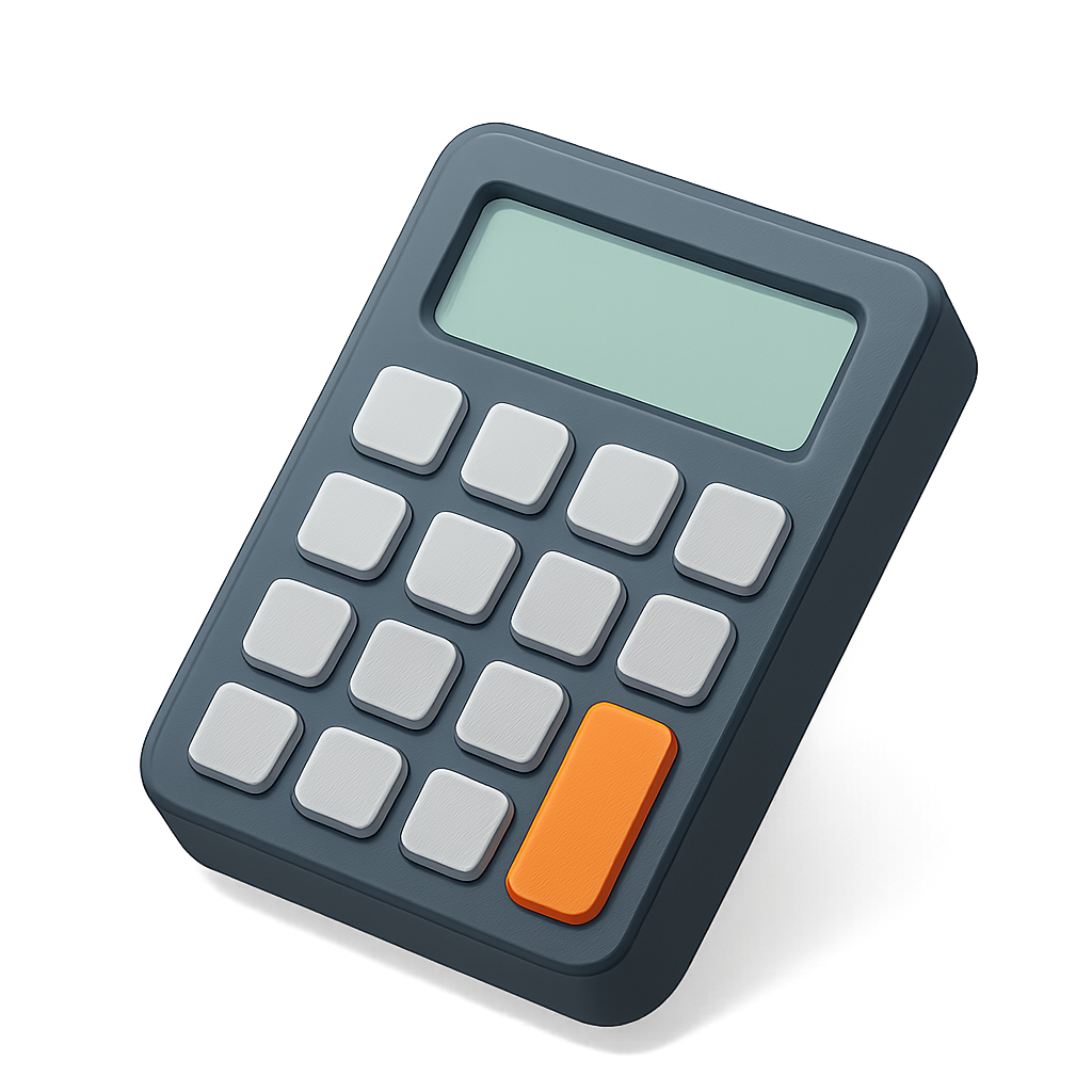 A sleek 3D calculator icon featuring a modern design with a dark blue body, light gray buttons, and an orange key. The icon is presented in a three-quarter view against a softly blurred background.