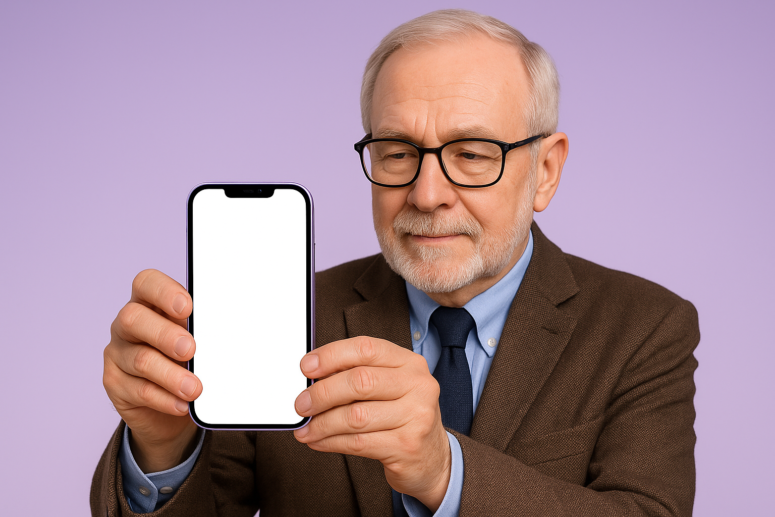 An elderly professor, wearing glasses, holds a purple smartphone with a blank screen. The background is a soft purple, enhancing the focus on the subject.
