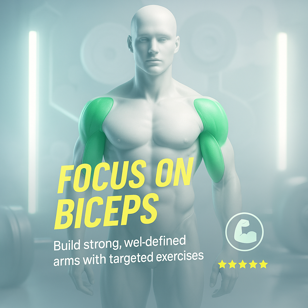 Dynamic fitness graphic showcasing a muscular figure highlighting bicep exercises. Ideal for workout guides and fitness marketing.