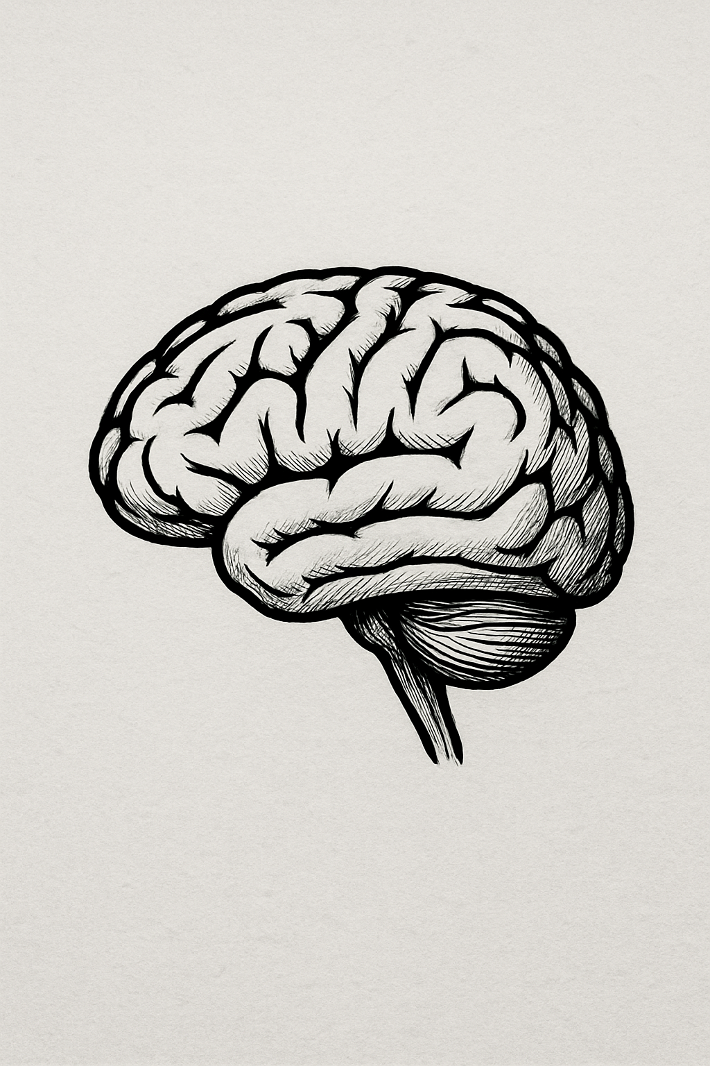 This image features a detailed, monochrome illustration of a brain, showcasing intricate line work. It is suitable for educational, medical, or artistic contexts.