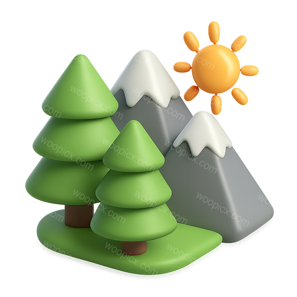 A vibrant isometric design featuring stylized green trees and grey mountains topped with snow, accompanied by a bright sun. The icon showcases a 3D feel with a transparent background.