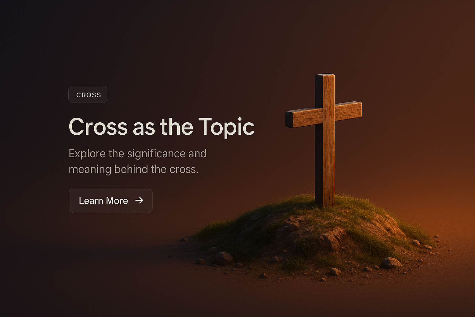 A zoomed-out 3D scene featuring a wooden cross on a small mound, set against a dark gradient background. The design includes text and a button for user interaction.