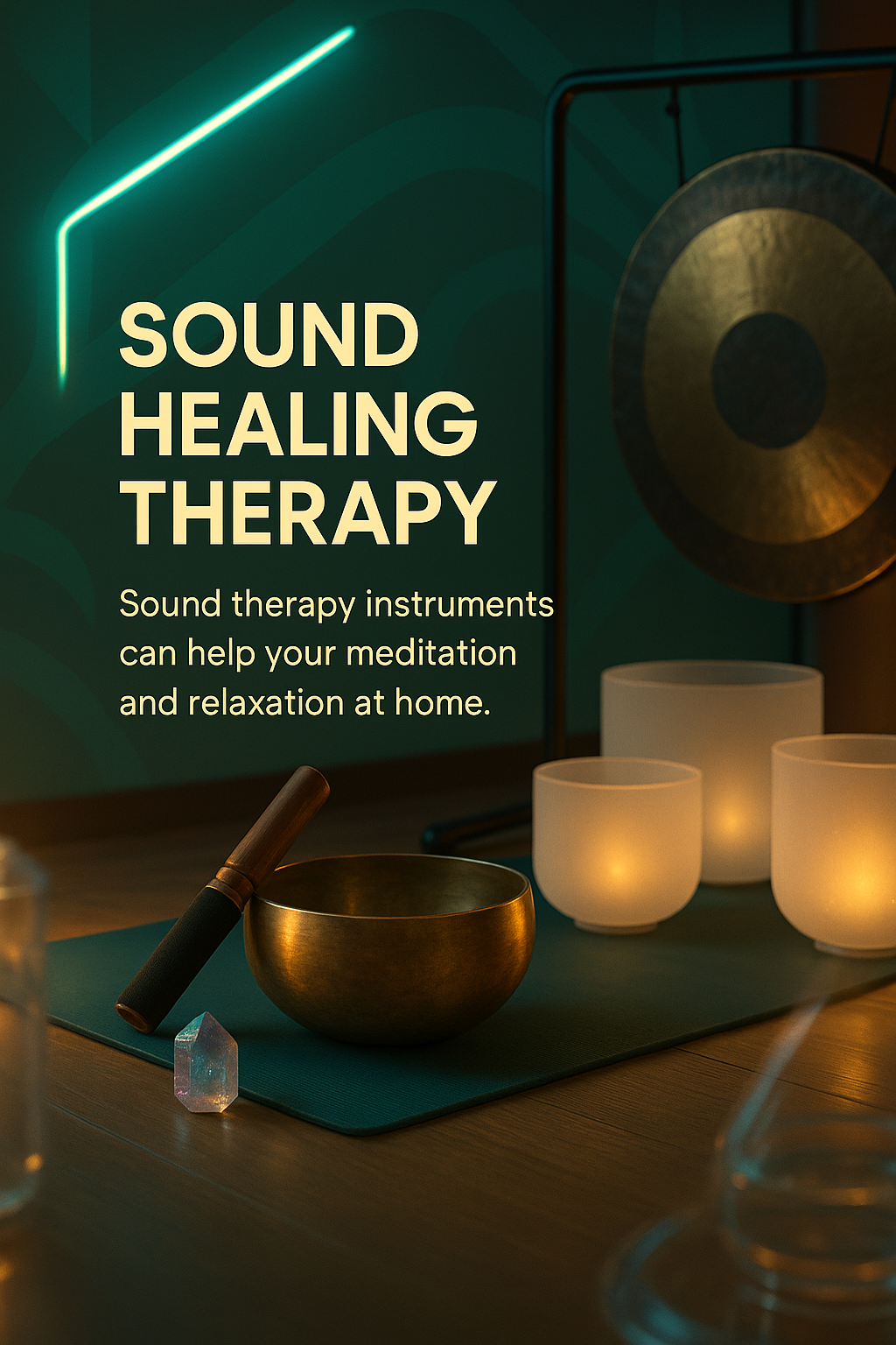 A calming image showcasing sound therapy instruments, including a singing bowl and candles, designed to promote relaxation and meditation at home.