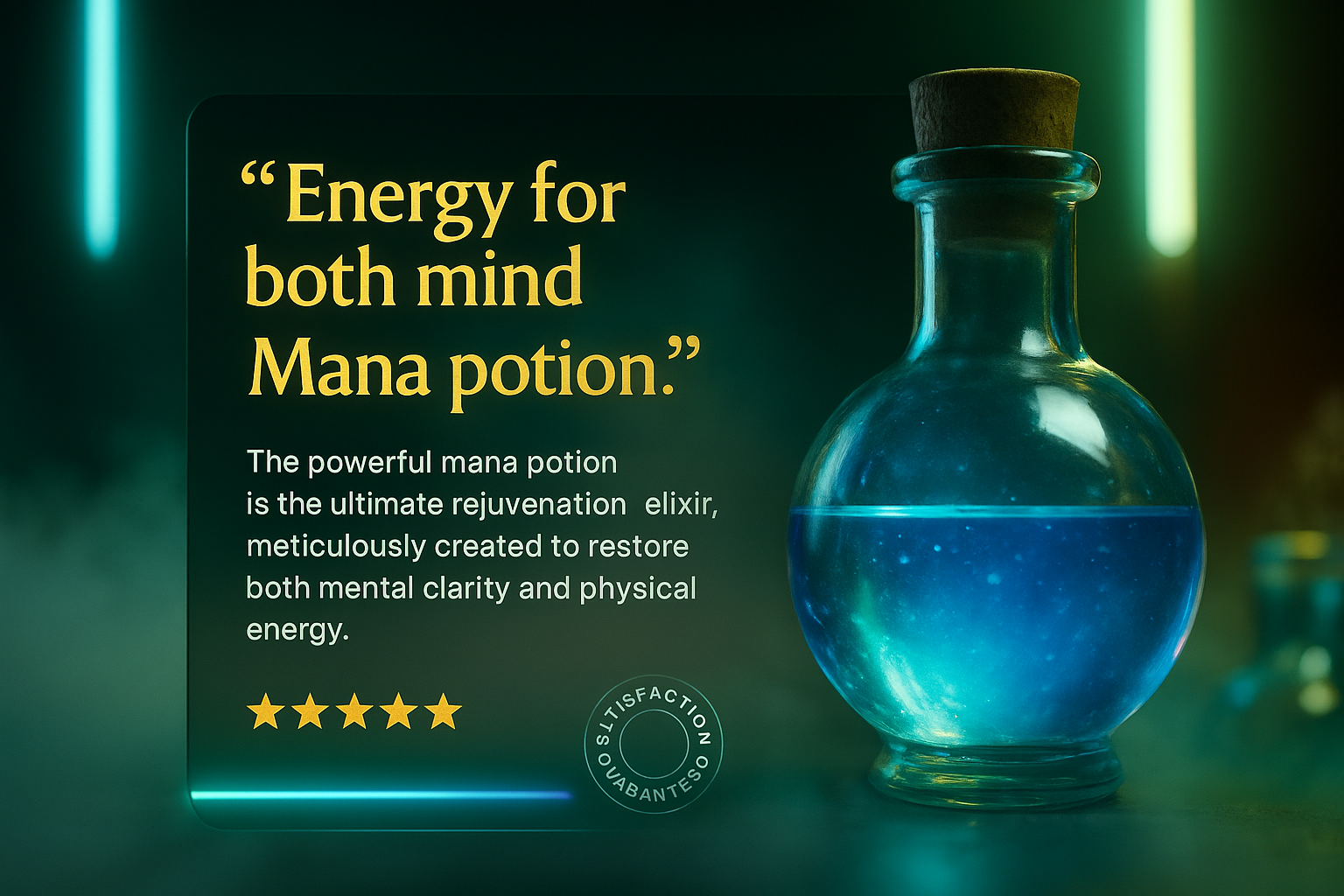 /Collection: /by davooda/Type: PNG/A captivating design showcasing a glowing mana potion with vibrant neon hues, featuring promotional text and star ratings, all set against a misty background.