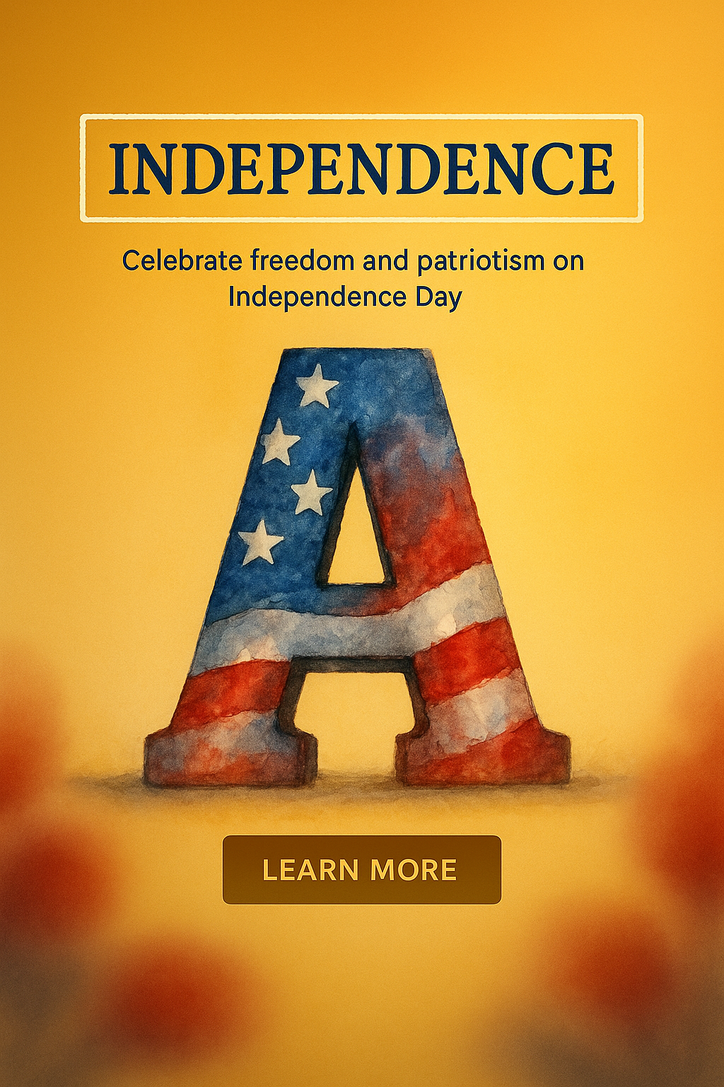 A vibrant graphic celebrating Independence Day with a stylized letter 'A' adorned in the American flag colors. Ideal for social media promotions and event announcements.