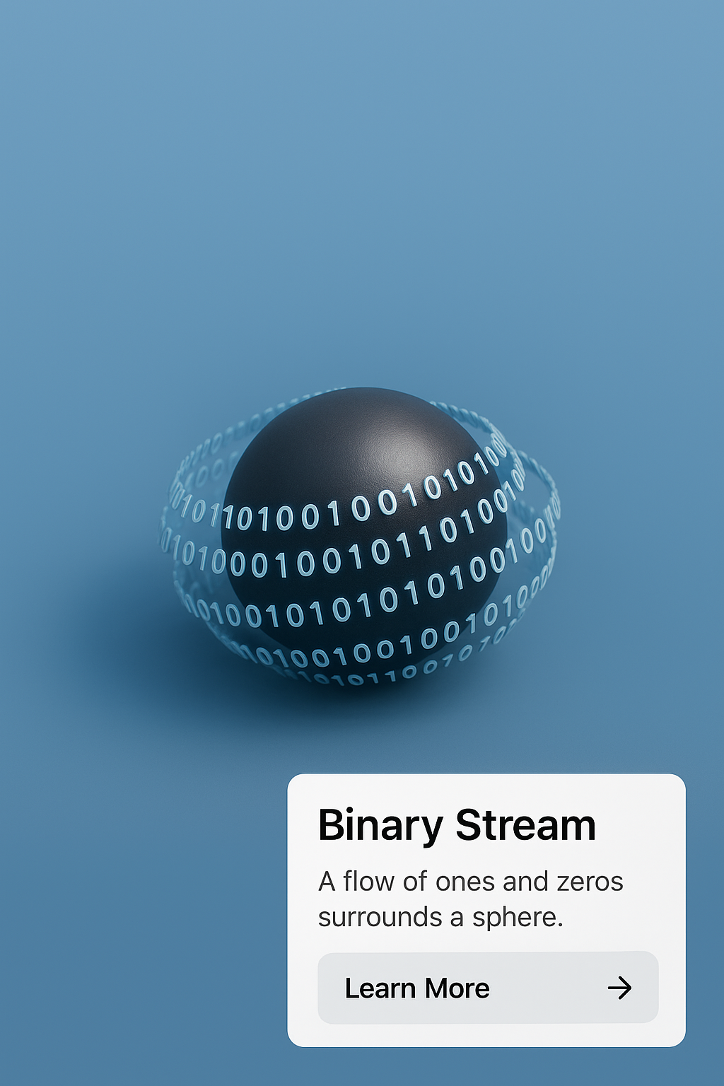 A visually striking 3D representation of a sphere surrounded by a flow of binary code, set against a smooth gradient background. The composition emphasizes realism and clarity.