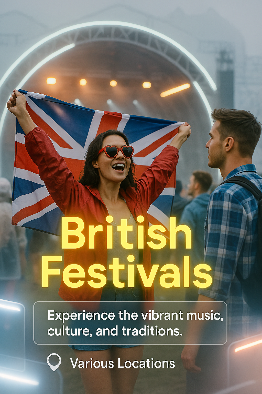 Vibrant promotional graphic showcasing British festivals with a lively atmosphere, perfect for event marketing and tourism promotion.