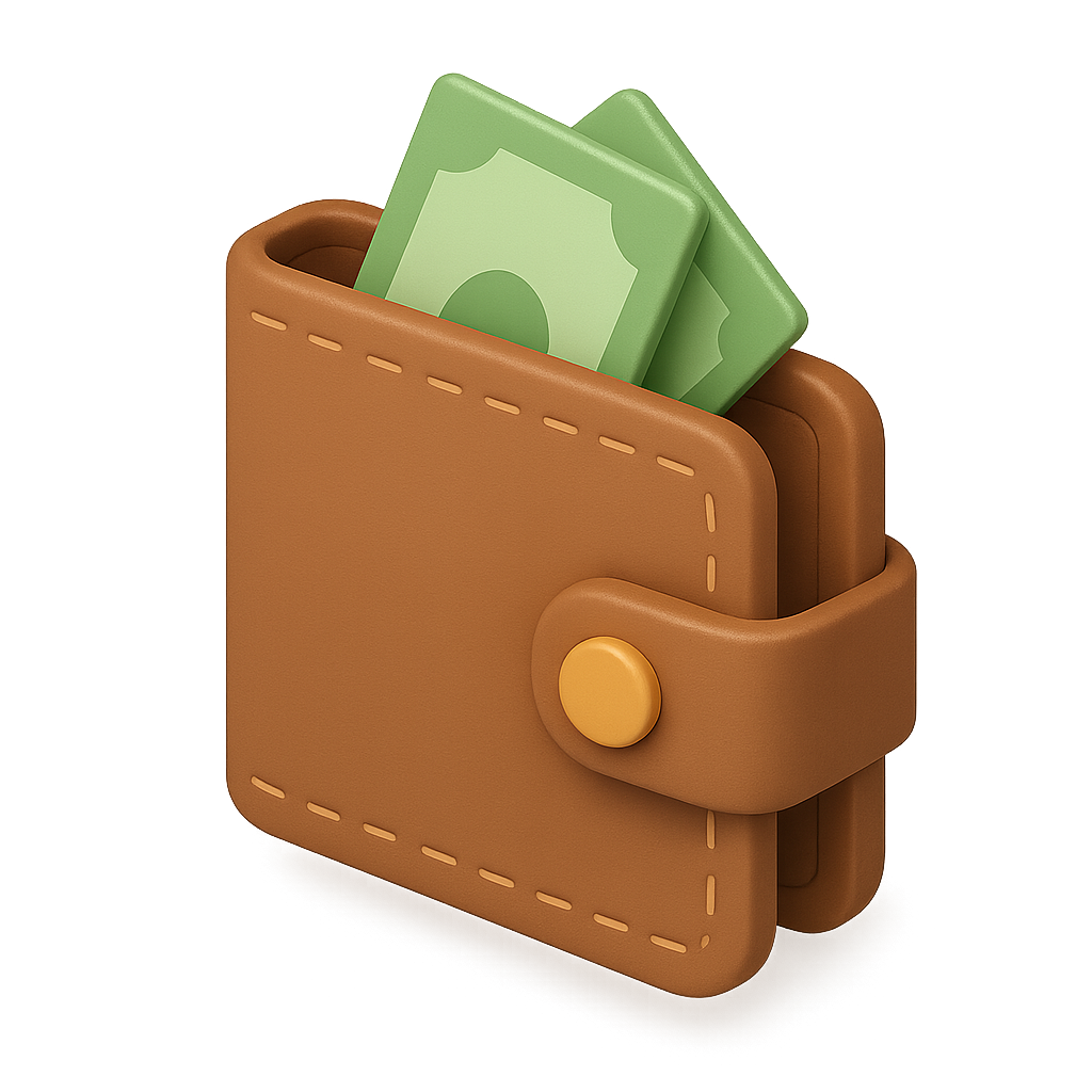 A visually appealing 3D wallet icon featuring a brown wallet with a button and cash visible inside. The design is isometric and volumetric, set against a soft gradient background.