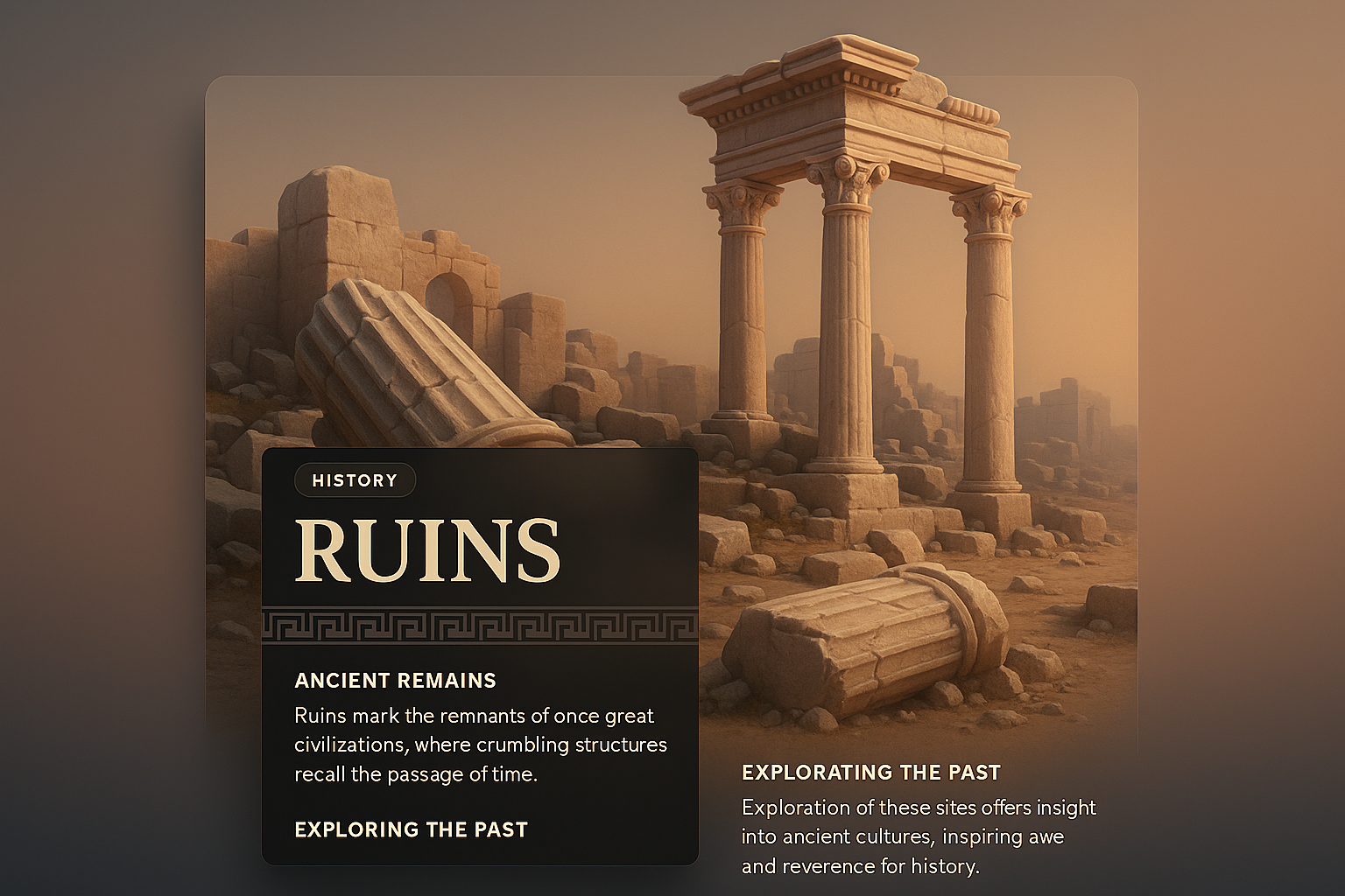 A stunning 3D illustration of ancient ruins showcasing crumbling structures and historical architecture. The design features a dark overlay with informative text about the significance of these remnants.