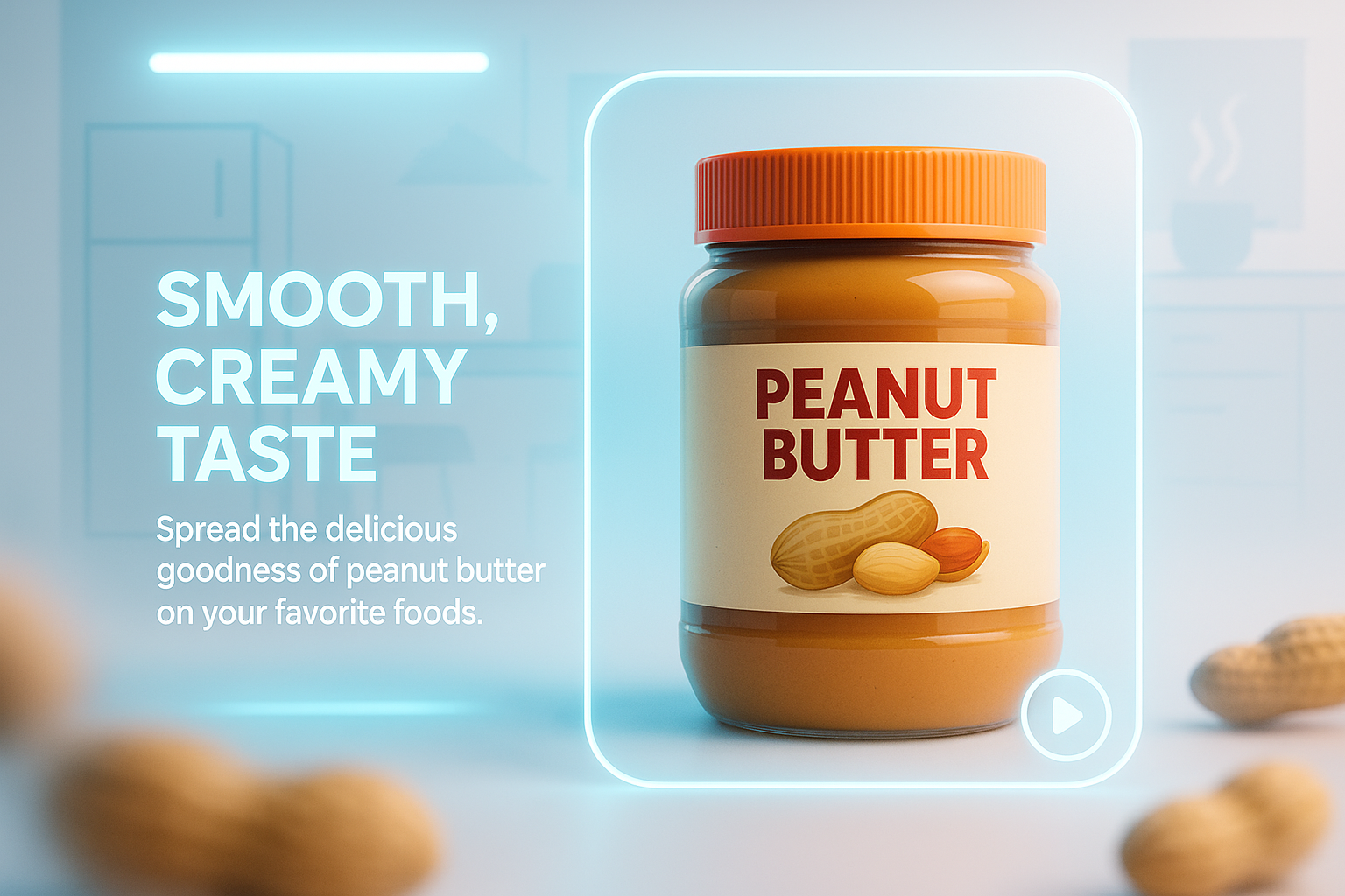 /Collection: /by davooda/Type: PNG/Visually appealing product advertisement featuring a jar of peanut butter against a soft-focus kitchen background. Ideal for food marketing and online grocery promotions.