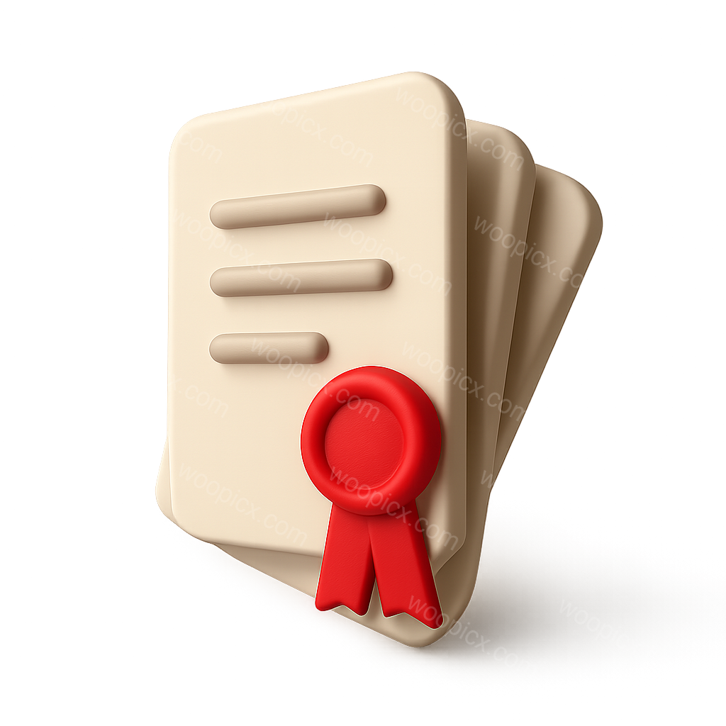 A 3D icon depicting a stack of documents with a red seal ribbon, designed with a transparent background and a three-quarter view for a volumetric effect.