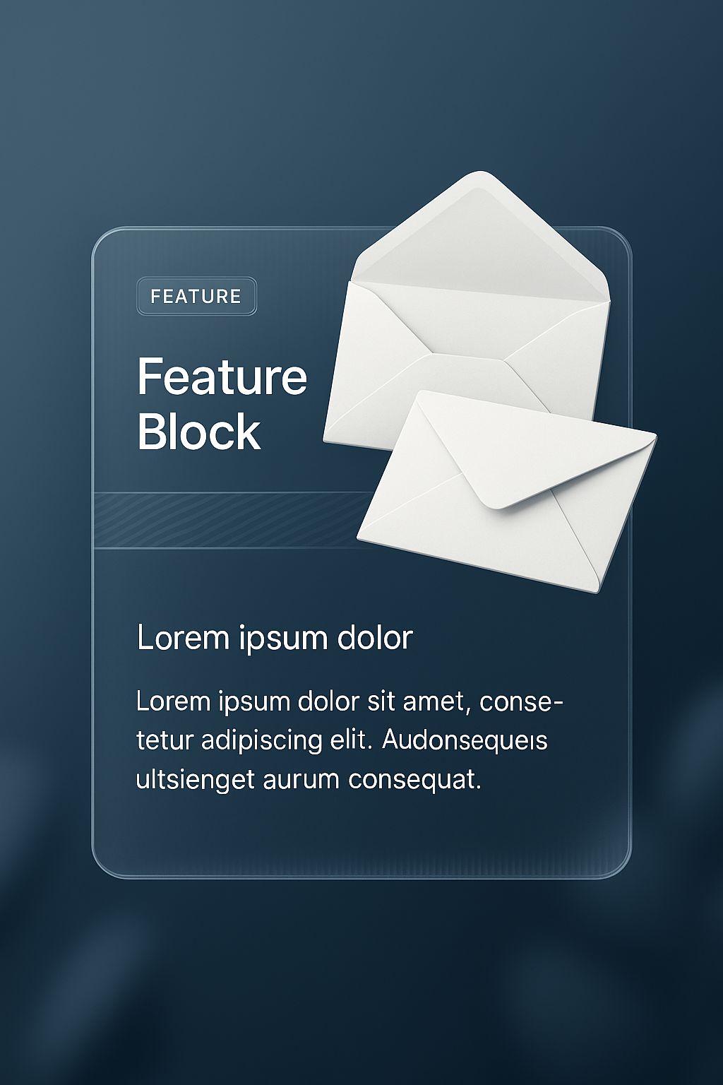 /Collection: /by davooda/Type: PNG/A visually appealing mockup featuring white envelopes, both open and closed, ideal for branding identity designs. The layered composition includes a gradient background and a feature block with text.