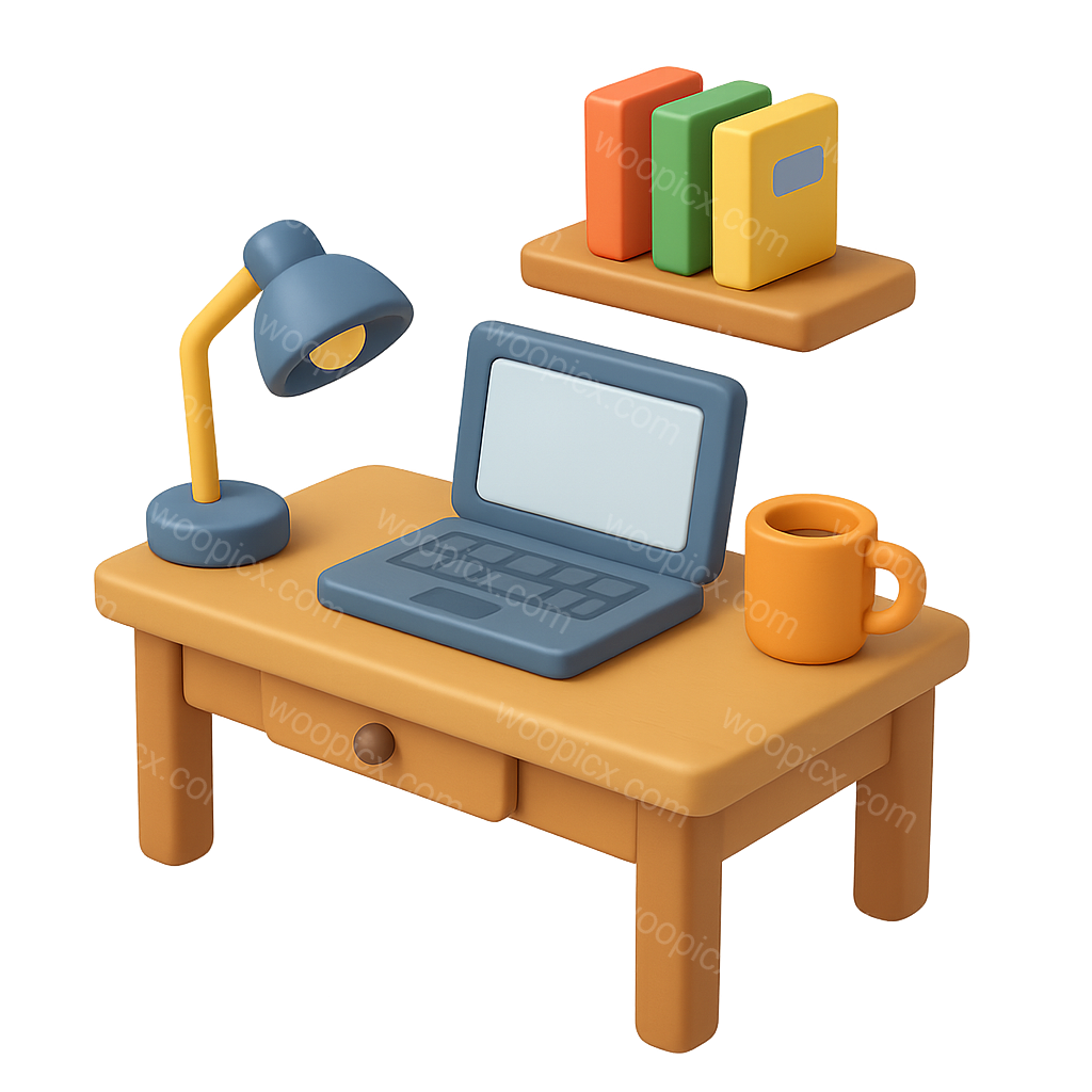 /Premium/Collection: /by davooda/Type: PNG/A visually appealing 3D icon of a home office setup featuring a desk with a laptop, a lamp, a coffee mug, and colorful books on a shelf, all designed in a volumetric style.
