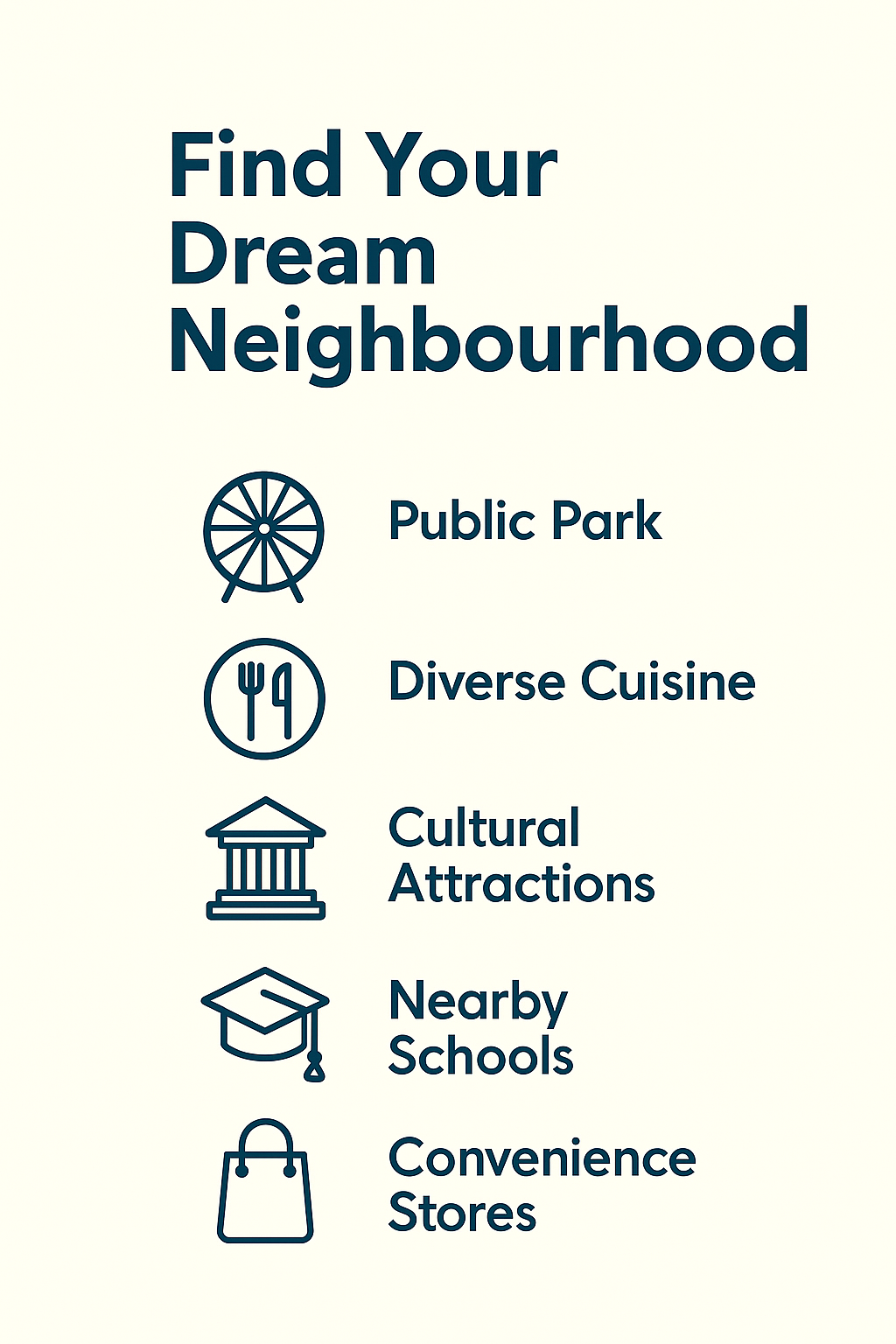 Informative infographic showcasing key features of an ideal neighborhood, using simple icons and a clean layout, ideal for real estate marketing.