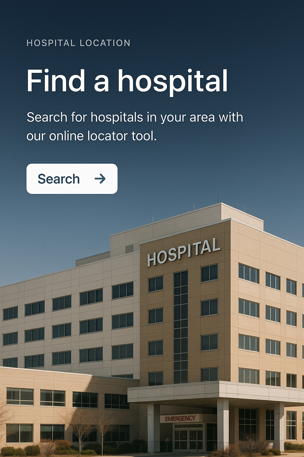 A modern hospital locator interface featuring a prominent building image, clear typography, and a call-to-action button. The design integrates a gradient background, enhancing visual appeal.