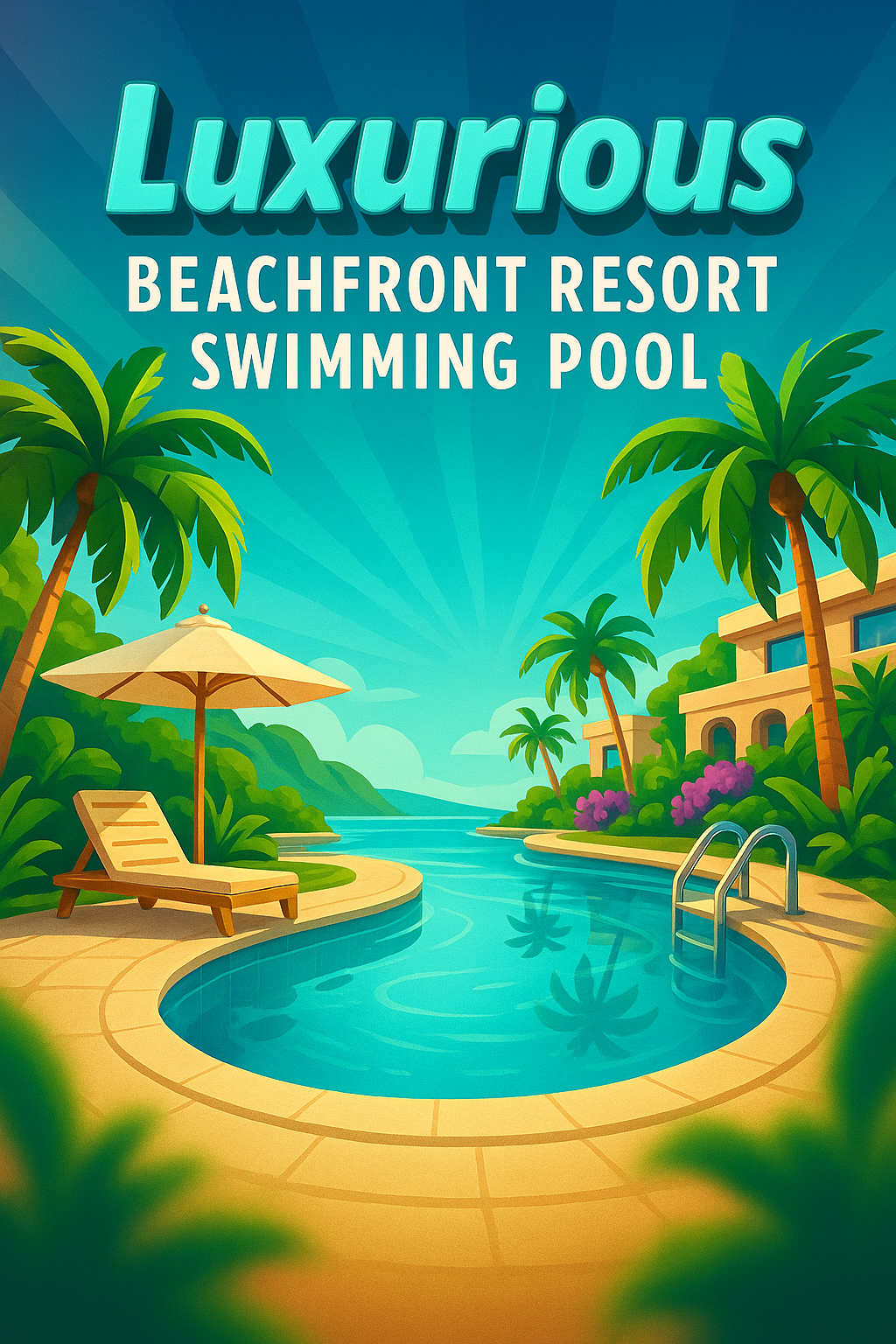 /Collection: /by davooda/Type: PNG/A vibrant illustration of a luxurious beachfront resort swimming pool surrounded by lush tropical vegetation. The dynamic composition features a smooth gradient background and a clear focus on the pool area.