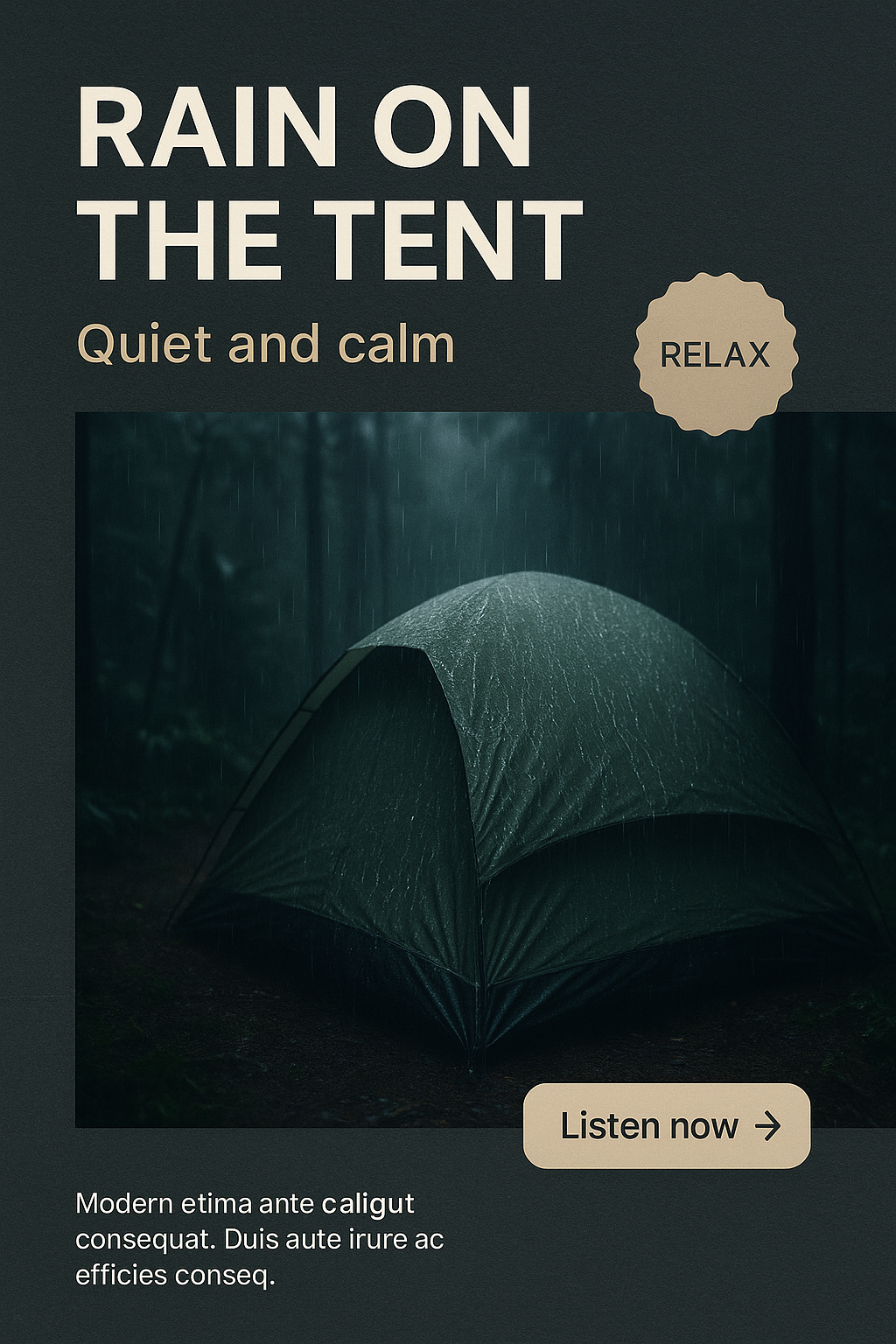 A serene image depicting rain falling on a tent in a lush forest. The calming atmosphere evokes feelings of relaxation and meditation, perfect for camping at night.