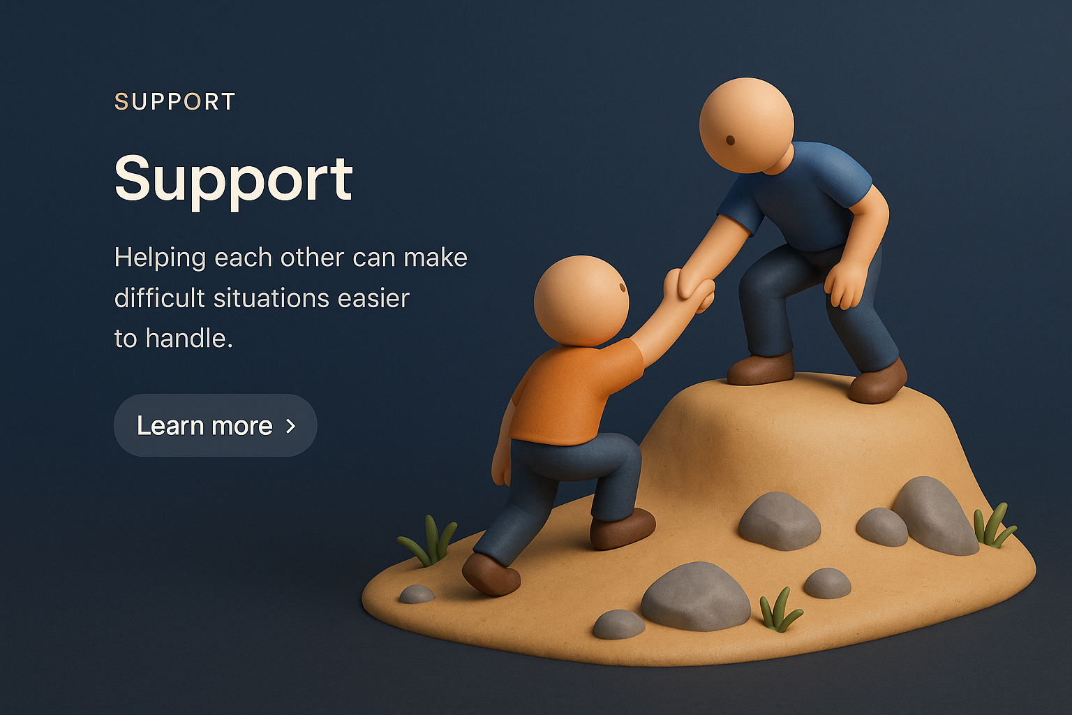 /Collection: /by davooda/Type: PNG/A detailed 3D scene depicting two stylized figures assisting each other on a small rocky hill. The background features a dark gradient, emphasizing the vibrant colors of the figures and the surrounding elements.