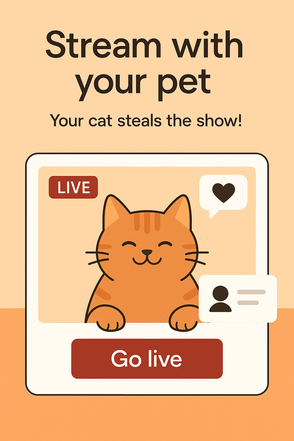 Playful social media graphic encouraging pet owners to stream with their cats, featuring a cartoon cat and modern design elements, ideal for pet-related platforms.