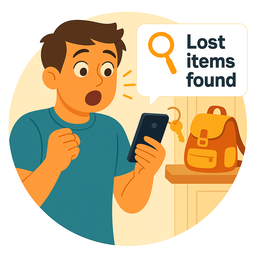 /Collection: /by davooda/Type: PNG/A vibrant digital illustration depicting a surprised individual looking at a smartphone, expressing joy upon receiving a notification about lost items being found. Ideal for apps or services related to lost and found.