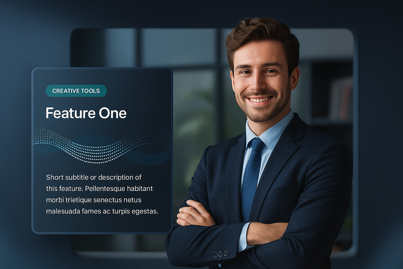 /Collection: /by davooda/Type: PNG/A smiling young businessman stands confidently in a stylish office, wearing a suit. He looks directly at the camera, embodying success. A feature block with a subtle design element integrates seamlessly into the scene.