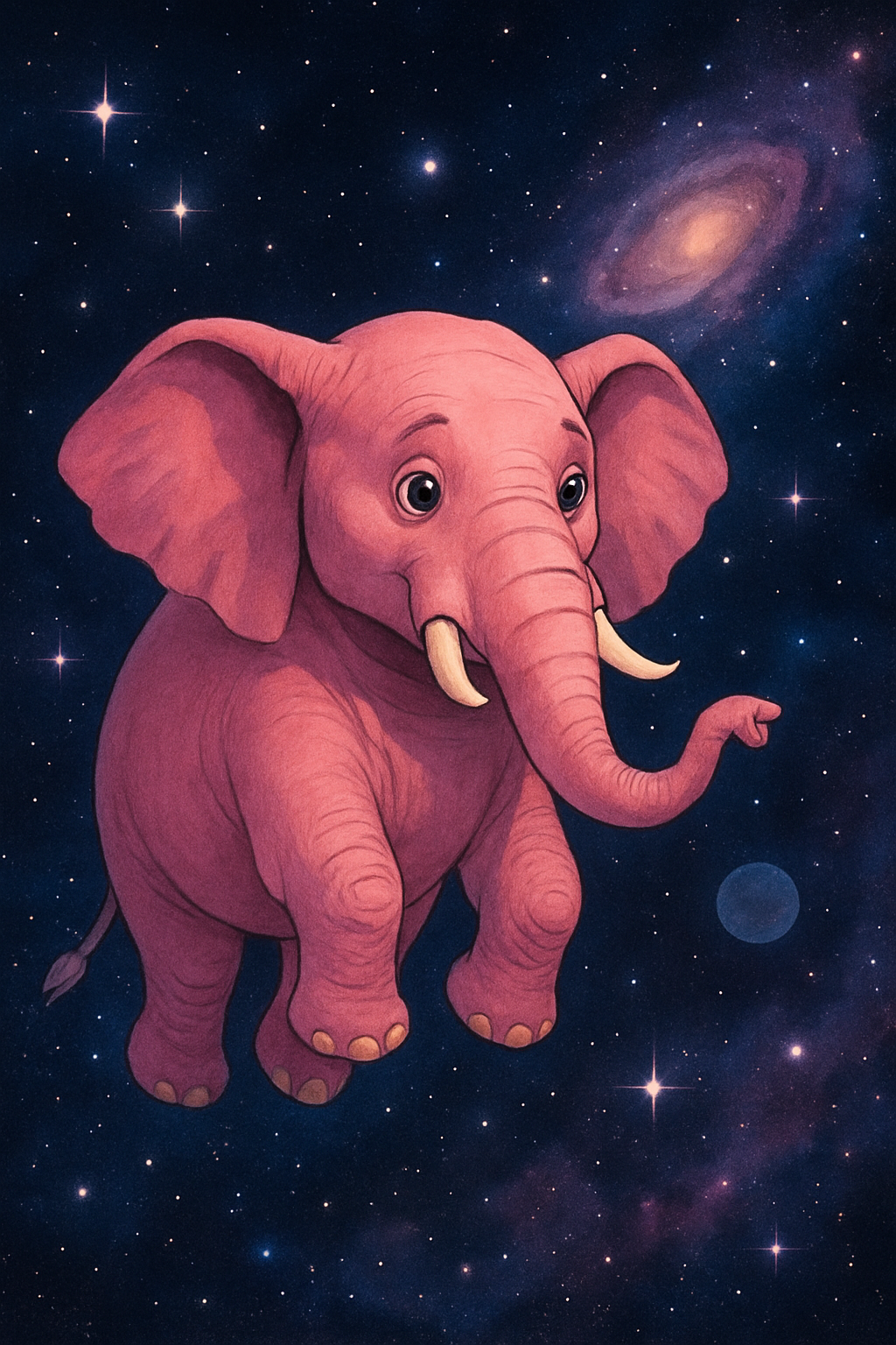 Charming illustration of a pink elephant floating in a cosmic space background, featuring stars and galaxies. Ideal for children's books or playful designs.