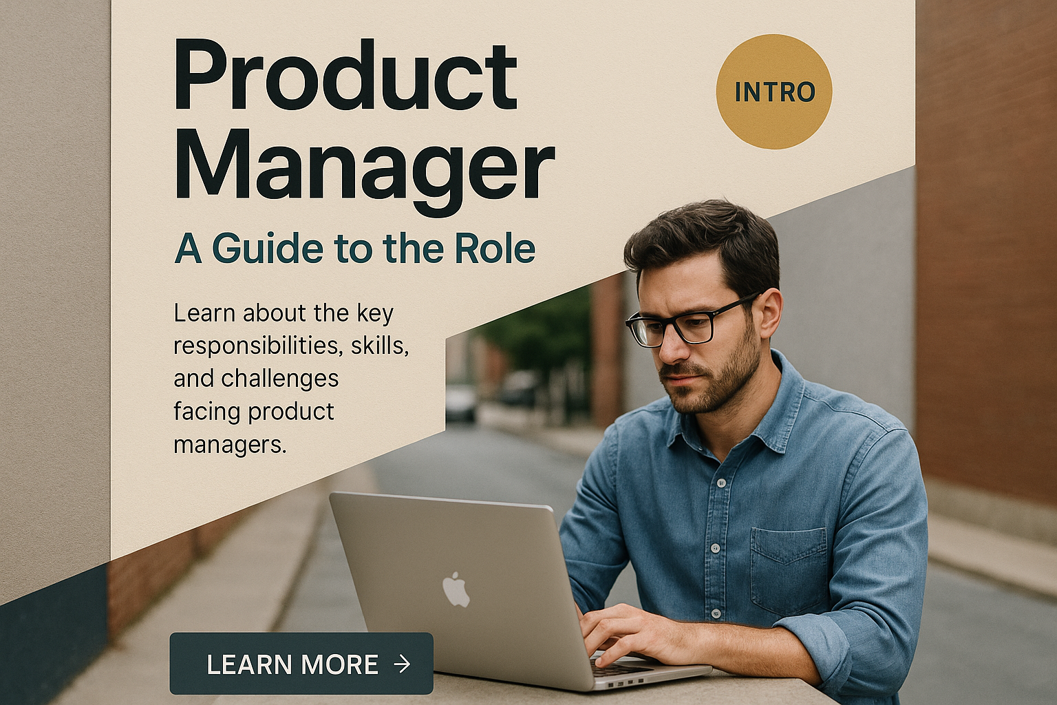 A professional layered design for a Product Manager guide featuring a man working on a laptop. It includes a title, subtitle, and call-to-action button with a balanced composition.