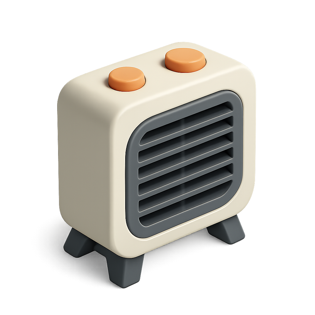 A stylized isometric icon of a heater featuring a cream-colored body, gray grill, and orange control buttons. The design emphasizes a three-dimensional feel.