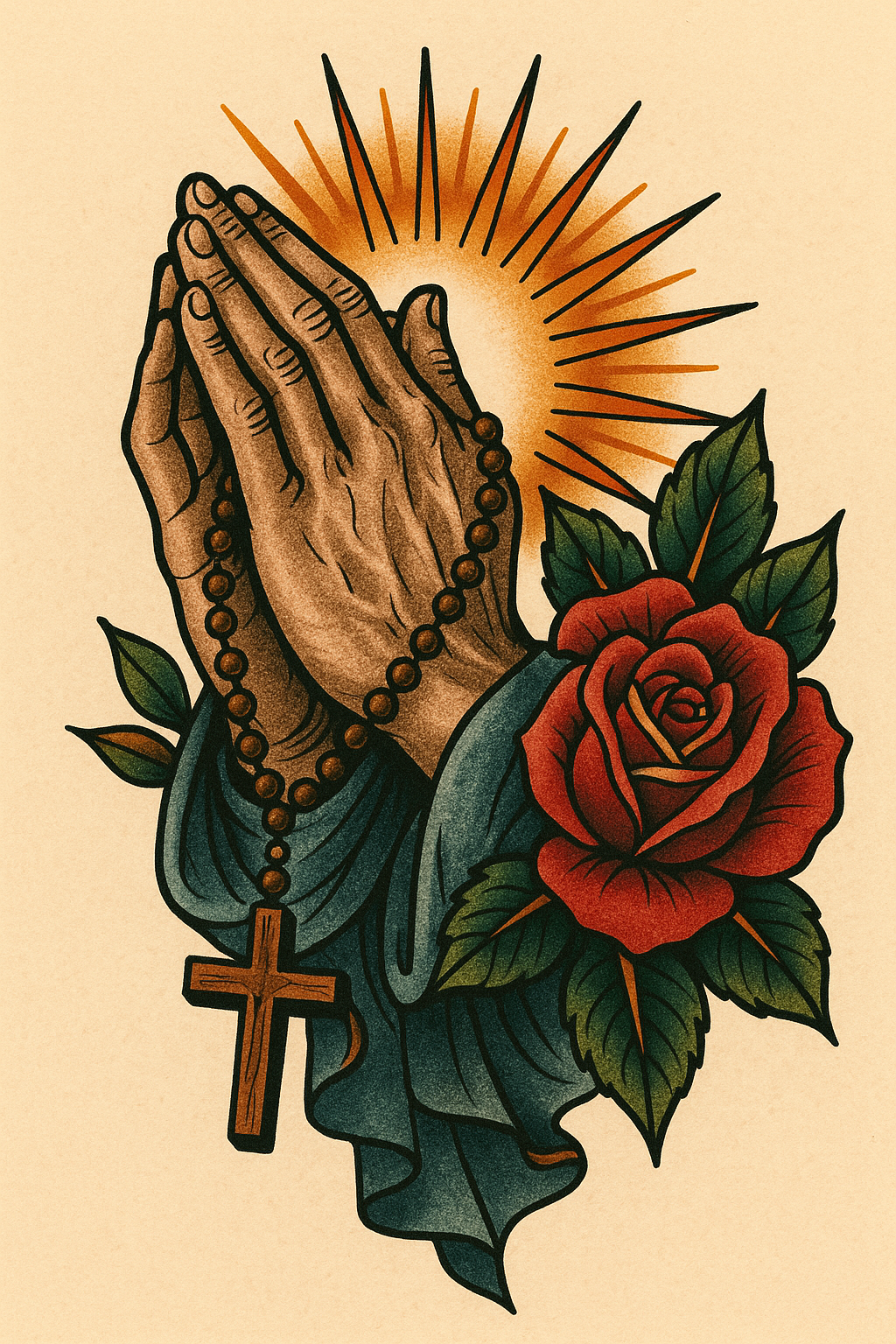 This digital illustration features praying hands with a rosary, a vibrant rose, and a radiant sunburst. Ideal for religious or artistic contexts.