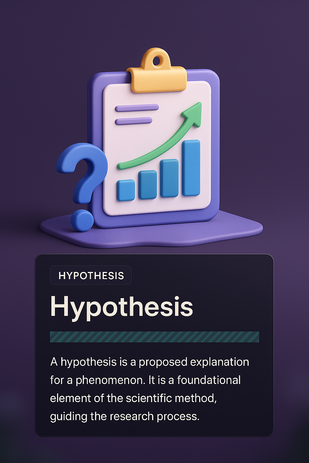 A visually engaging 3D illustration showcasing a hypothesis with a growth chart. The design features a dark panel integrating smoothly into the background, enhancing the educational theme.