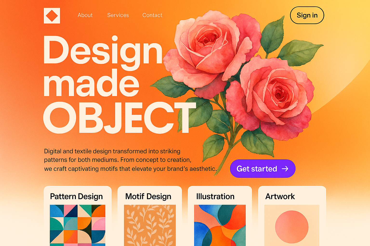A vibrant and modern landing page featuring hyper-realistic watercolor roses. The layout includes bold text and colorful blocks, creating a dynamic yet minimalistic aesthetic.