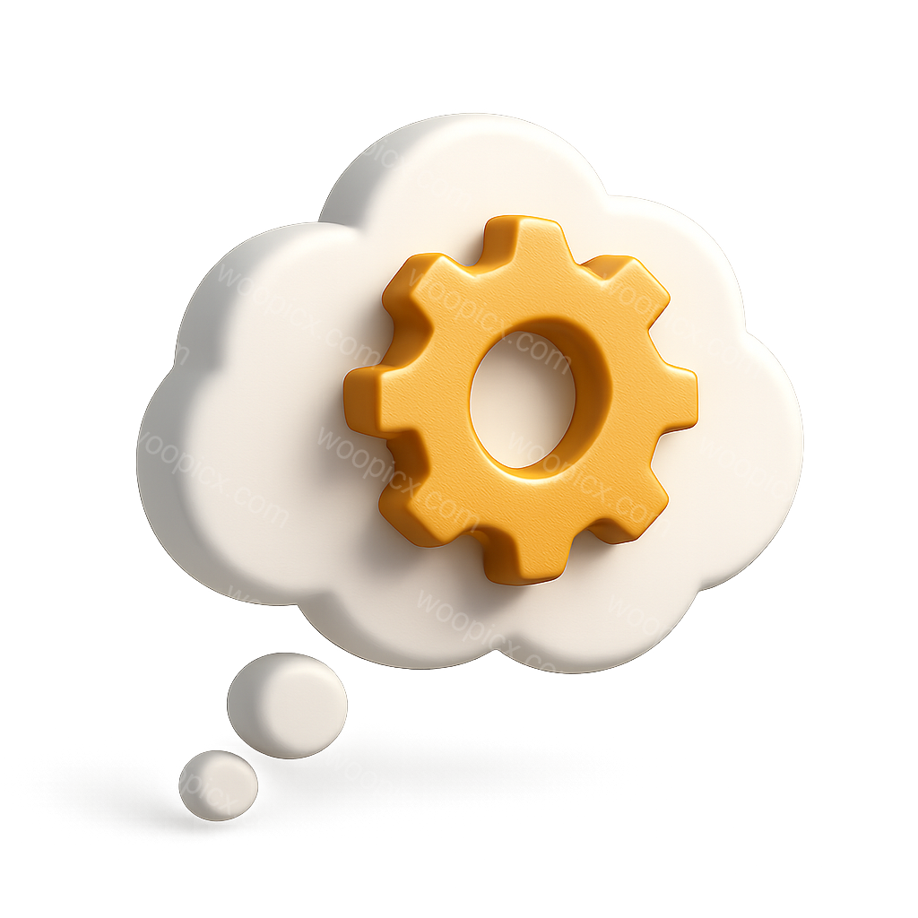 A 3D thought bubble featuring a prominent gear in the center. The icon has a transparent background and showcases a volumetric, isometric style.