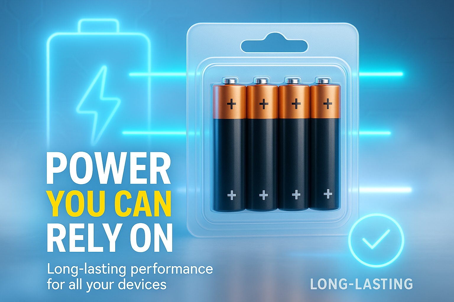 /Collection: /by davooda/Type: PNG/Modern promotional image featuring a pack of batteries, emphasizing reliability and long-lasting performance. Ideal for advertising tech or consumer electronics.