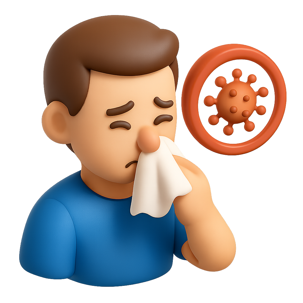 A 3D icon showing a person with allergy symptoms, holding a tissue to their nose. A virus symbol is depicted in the background, emphasizing the theme of allergies.