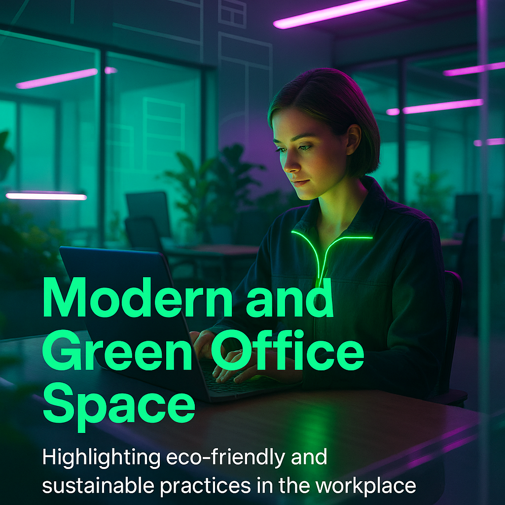 /Collection: /by davooda/Type: PNG/Visually striking image of a modern office environment focusing on eco-friendly practices. The use of vibrant colors and lighting creates an engaging atmosphere suited for promoting sustainable workplace initiatives.