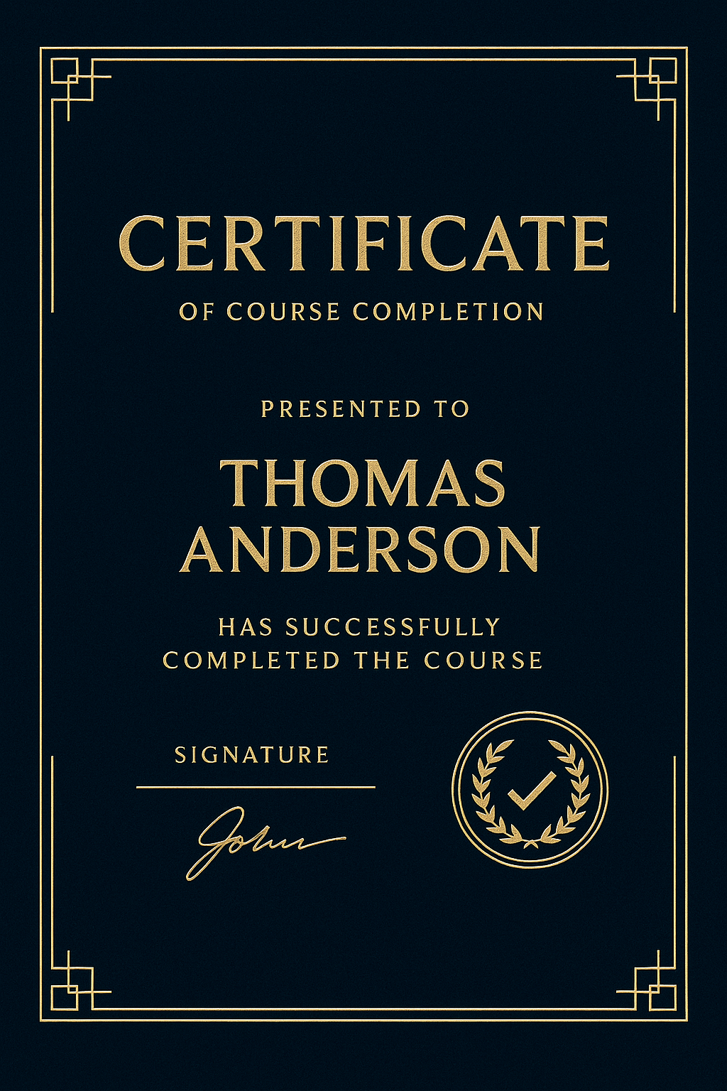 Sleek and formal certificate design featuring gold typography on a dark background, ideal for academic or professional course completions.
