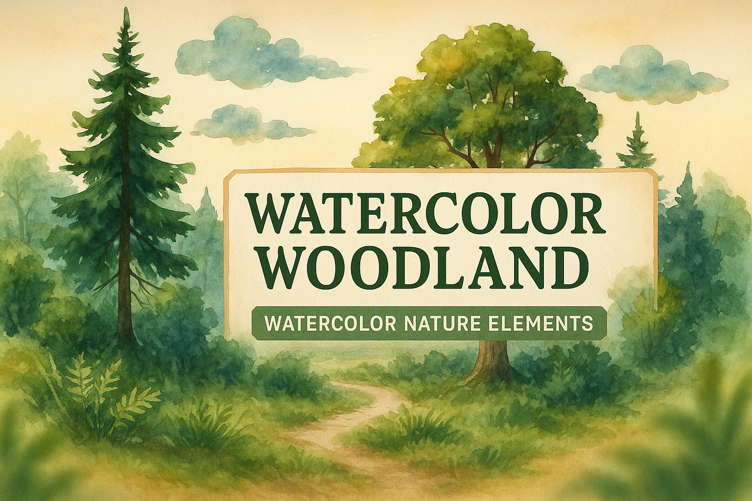 A beautifully rendered watercolor illustration showcasing a tranquil woodland scene with lush greenery and soft clouds, ideal for nature-themed designs or decor.