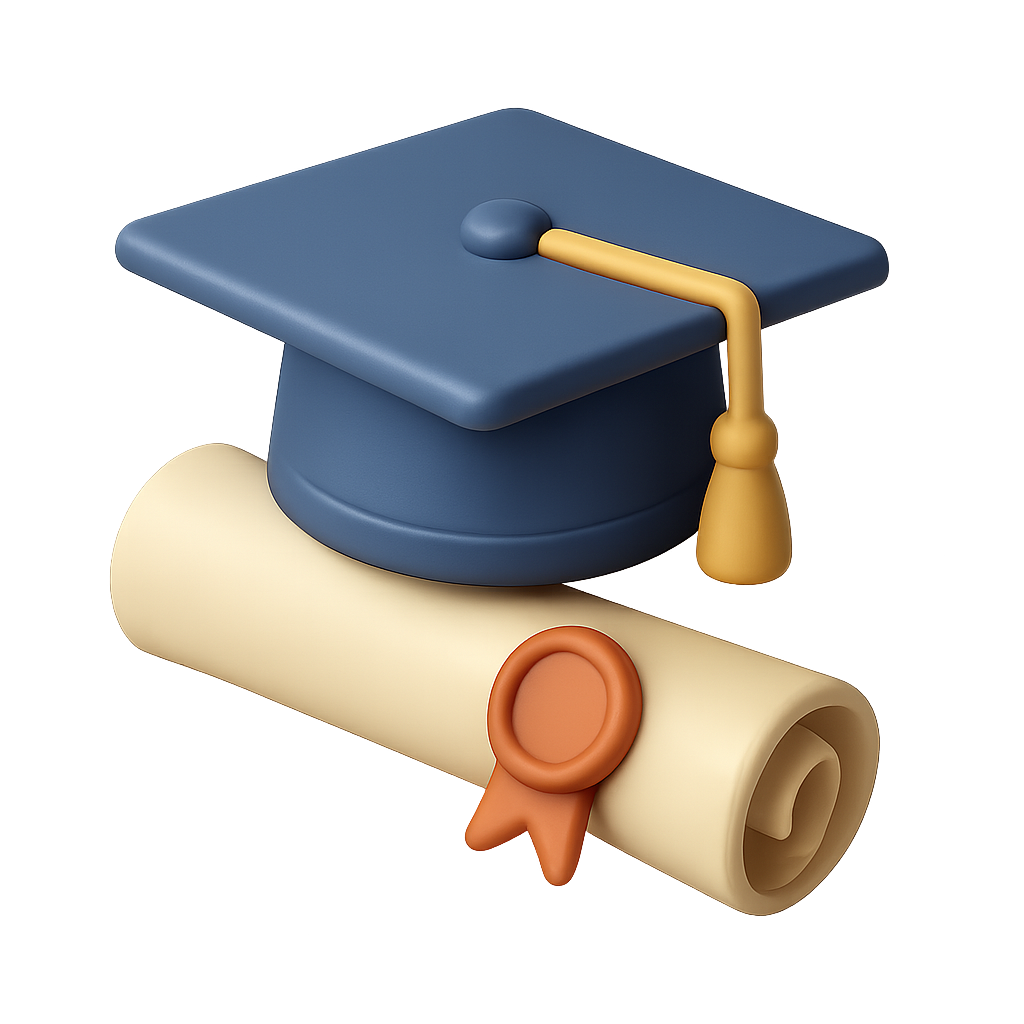 This image features a 3D isometric icon of a graduation cap resting atop a rolled diploma, enhanced with a ribbon. The design has a transparent background, emphasizing the volumetric feel.