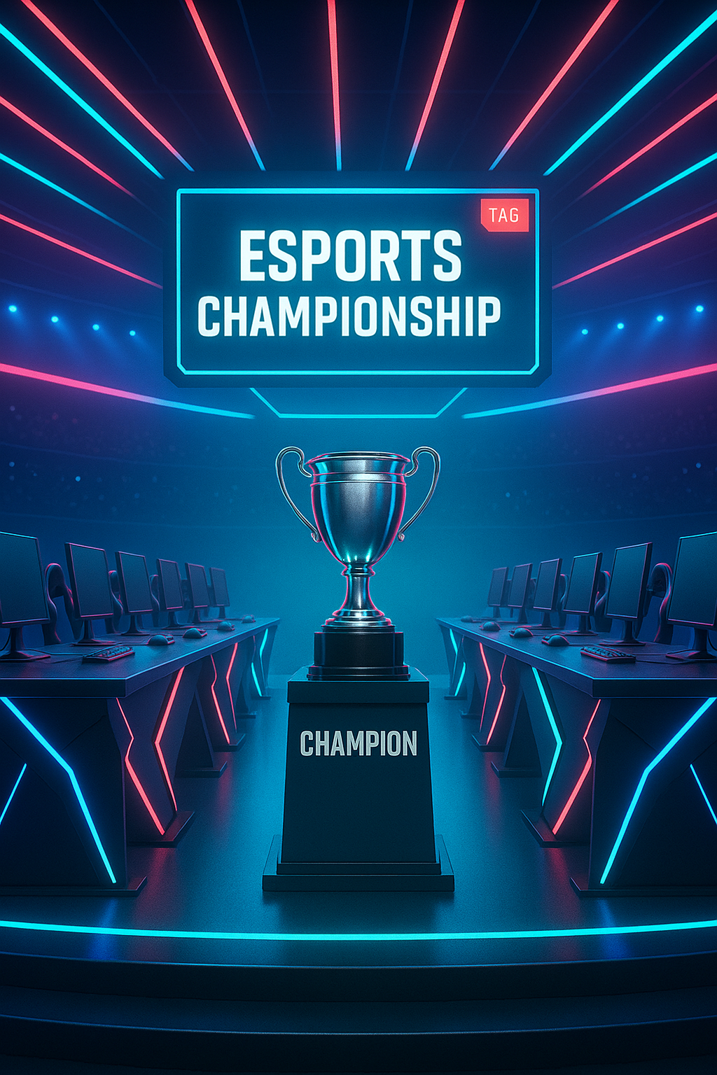 /Collection: /by davooda/Type: PNG/Vibrant esports championship graphic featuring a trophy centered in a modern gaming arena. Ideal for promotional materials targeting gamers and esports enthusiasts.