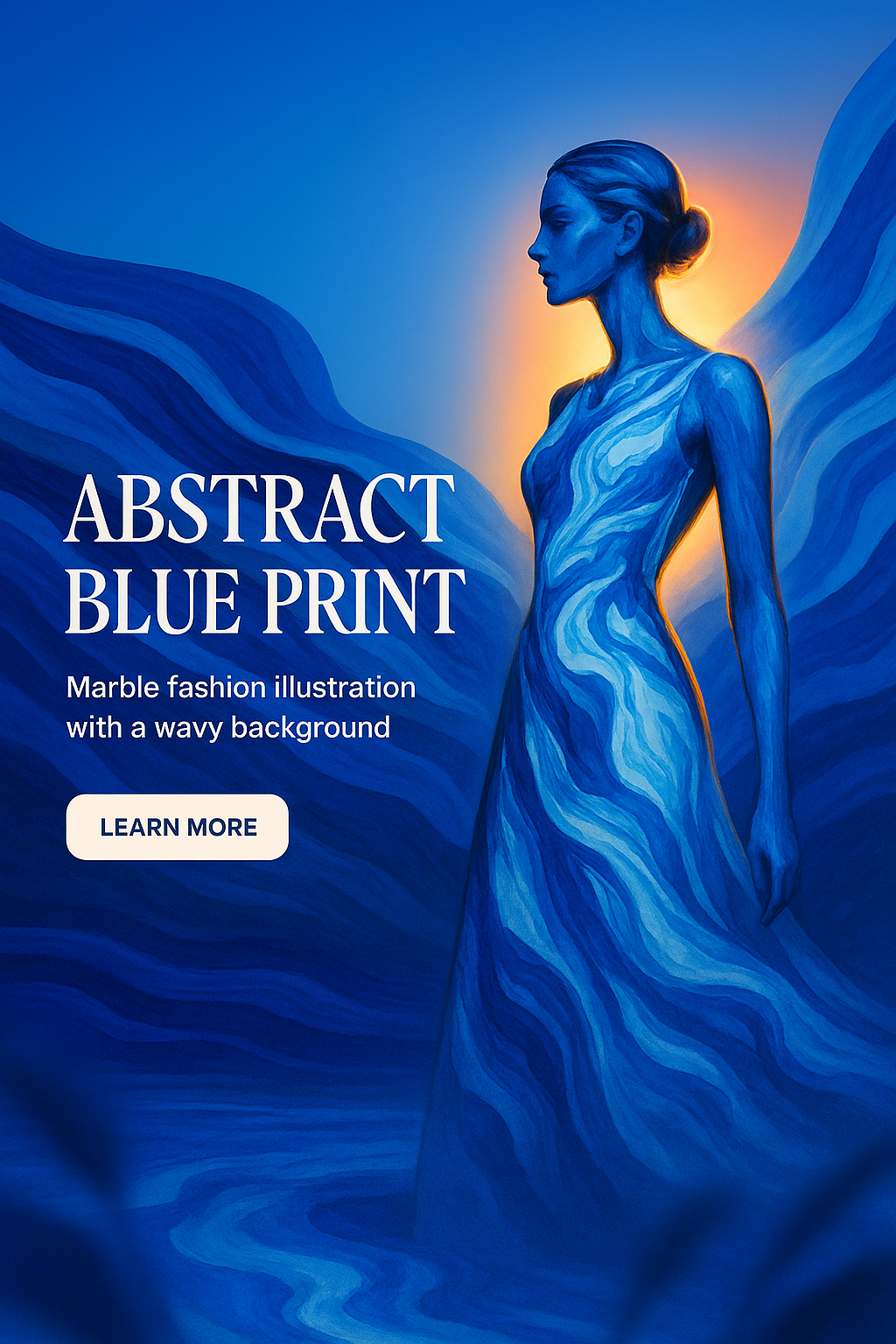 This image features a marble-style fashion illustration of a woman against a wavy blue background. Ideal for fashion branding and artistic promotions.