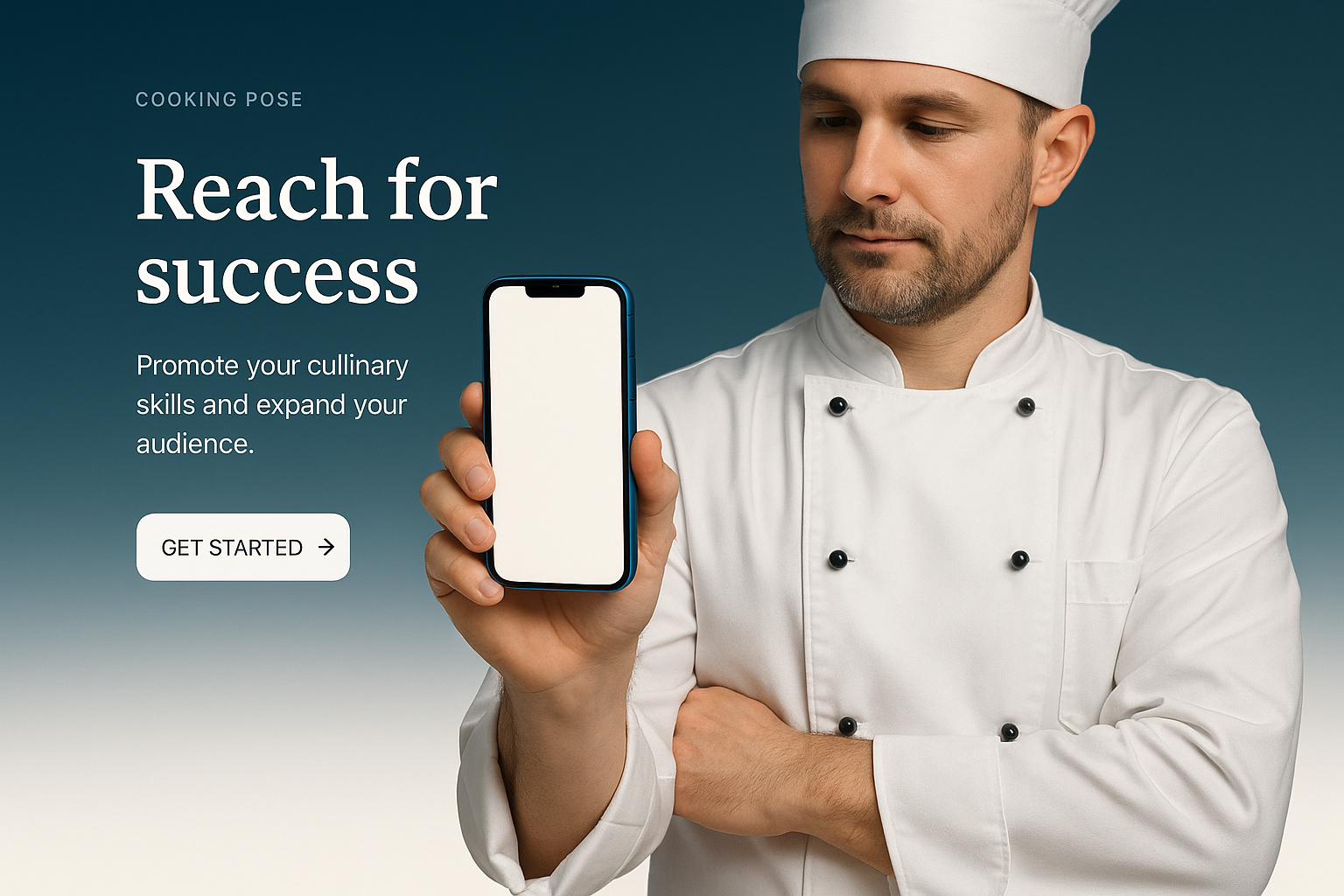 A chef in a culinary pose holds a blue smartphone with a blank screen, symbolizing success in promoting culinary skills. The background features a gradient from dark to white.