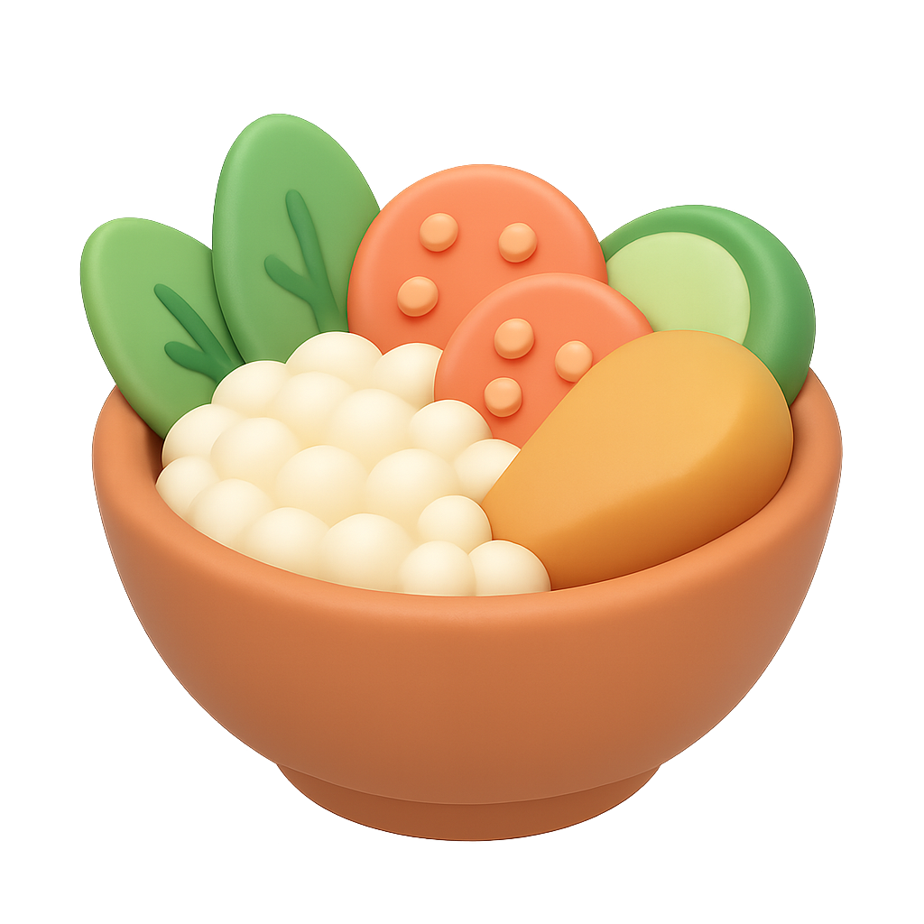 A vibrant 3D bowl filled with various food items, including vegetables and grains, presented in a three-quarter view with a soft, isometric design.