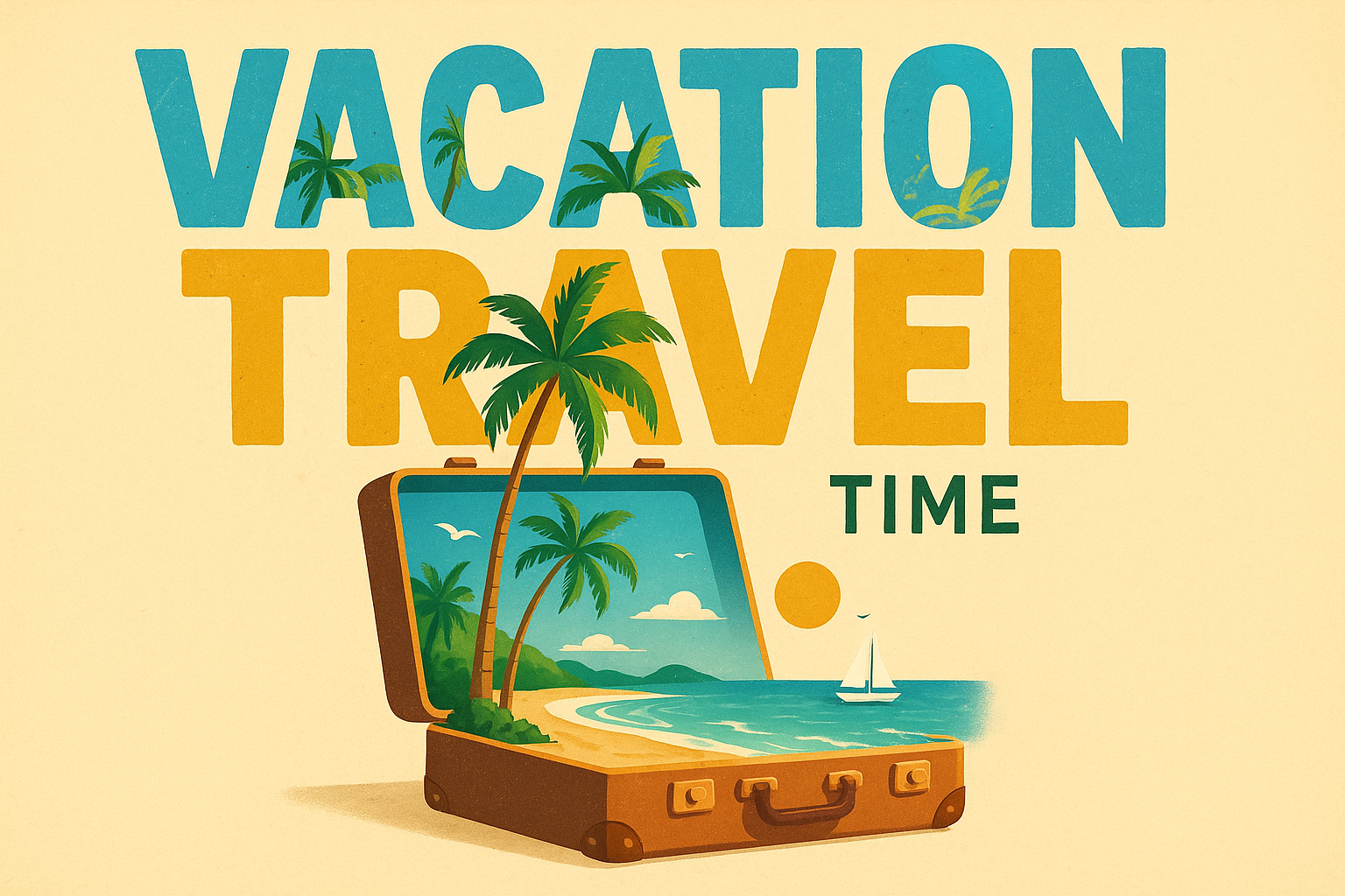 Colorful Vacation Travel Graphic Featuring Suitcase and Beach Scene