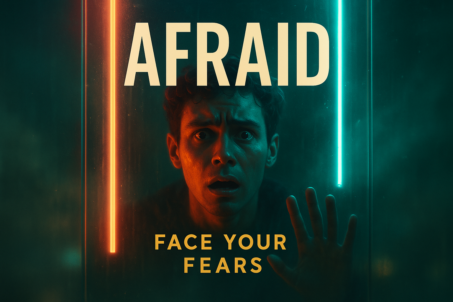 A dramatic scene featuring a person expressing fear, illuminated by neon lights. The background is abstract with a foggy effect, creating depth and intrigue.