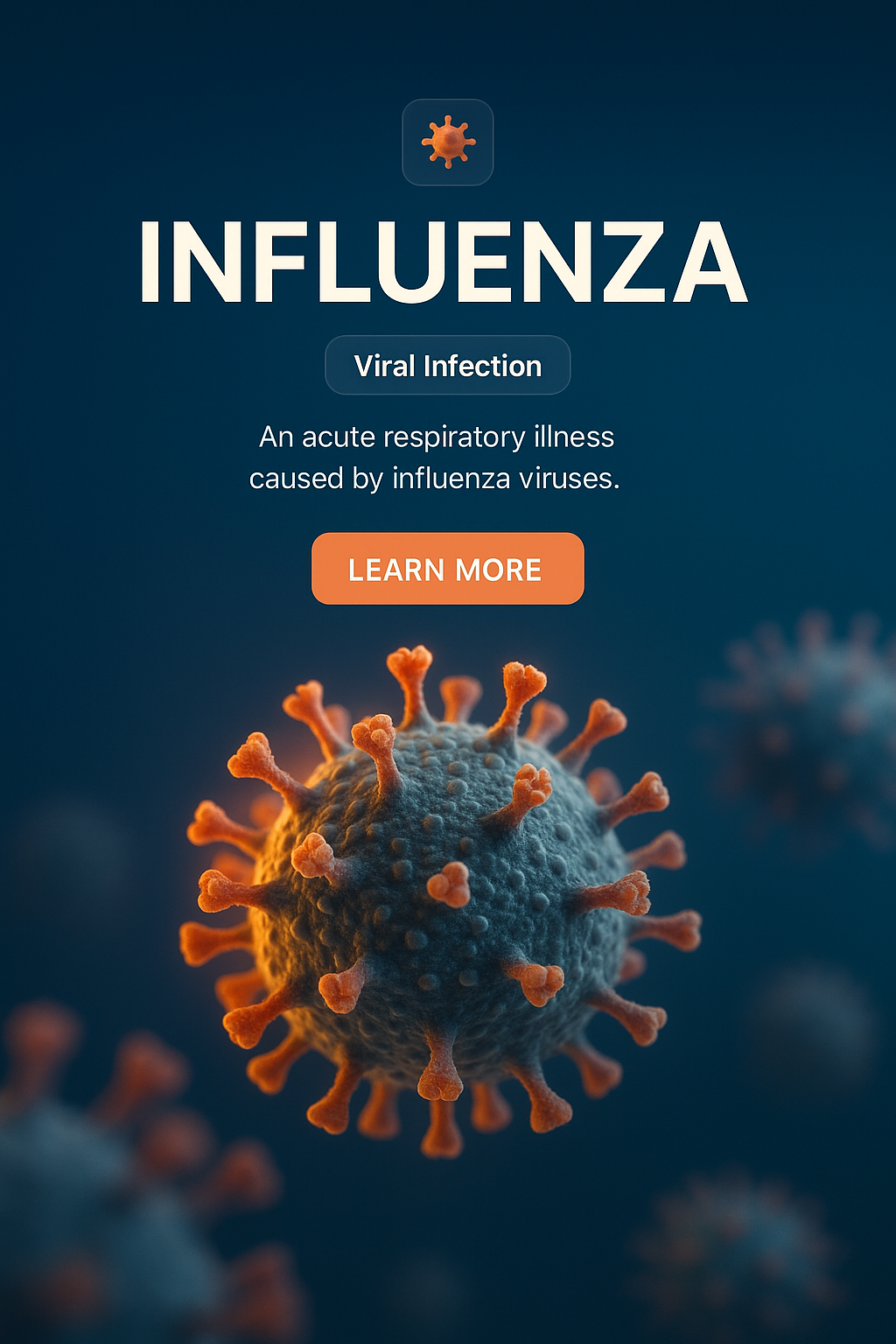 /Collection: /by davooda/Type: PNG/A visually striking graphic depicting the influenza virus, designed for educational content. The dark background contrasts with the vibrant virus illustration, suitable for medical or health-related websites.